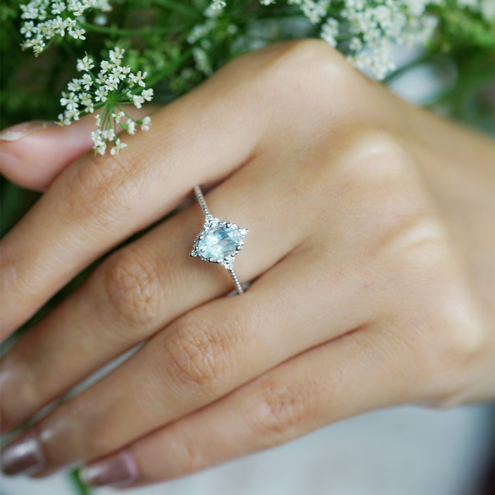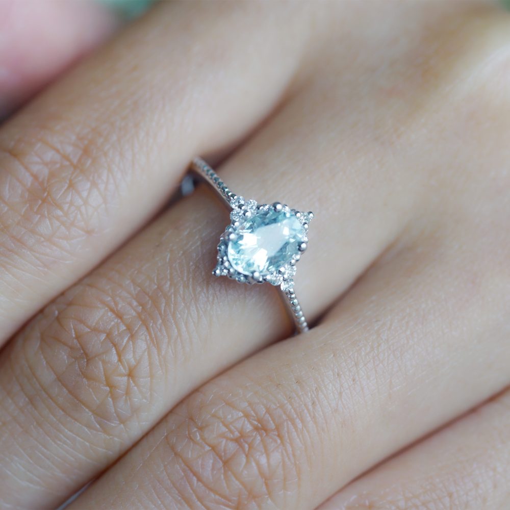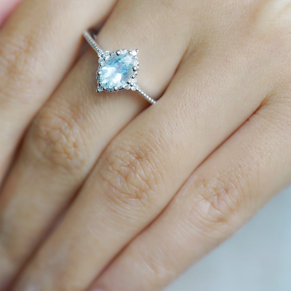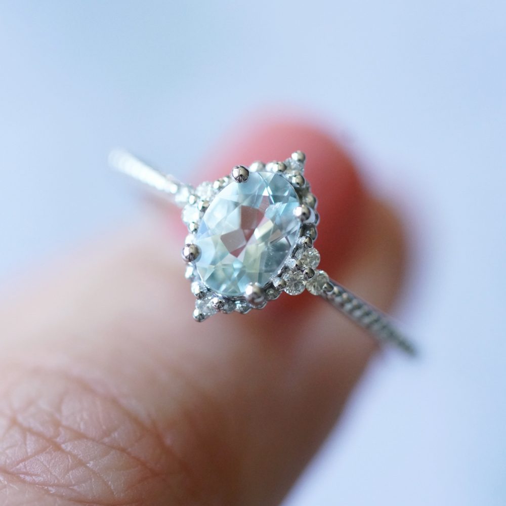 Mirror mirror on the wall, who’s the fairest of them all? – a woman could simply ask this charming hand companion, as its heavily symmetric form consisting of a central aquamarine and eight diamonds is reminiscent of the famous omniscient mirror. The key gem is guarded by a triplet of precious diamonds by the sides, while the top and the bottom is enhanced by a single one respectively. The upper shank is also made more special with a little touch up on the texture, just the right way for the future Snow White.
