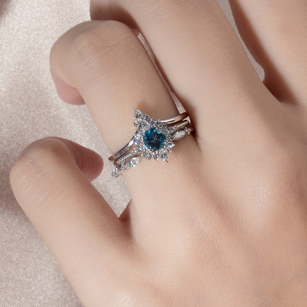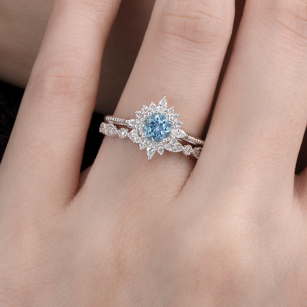 This lavish stone cluster is placed on a raised basket middle, featuring scrolling ribbons underneath. Round brilliant-cut diamonds and fanciful marquise accents are prong-set around the center Aquamarine stone, giving this design a unique art deco style. A shiny, milgrain band also adds comfort to this striking ring, making it perfect for wearing every day as an engagement or anniversary ring.