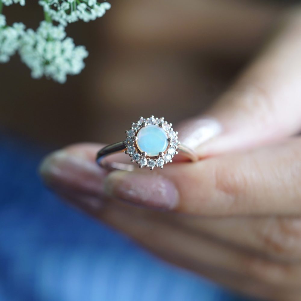Immerse yourself in the spectrum of colors of this precious round Australian Opal. The flamboyant color play is enhanced by the halo made of natural white sapphires, which makes the whole ensemble look so innocent and pure. This engagement ring’s gemstone is captured in a six-prong setting, making the whole structure very robust. “Lovelace” is bound to improve every jewelry set a lady wears with its simplicity.