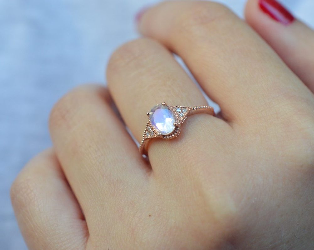 We proudly present you “Valeria”, our classy yet unique moonstone ring is made for engagement purposes. Surrounded from both sides by diamond triplets, the mystique blue moonstone gem captivates your attention with its enchanting glow. The shimmering “Valeria” represents the love, honor, and faithfulness that a lady has for her fiancé. An intuitive and imaginative woman is the most convenient wearer of this artisan piece.