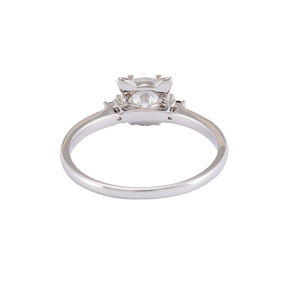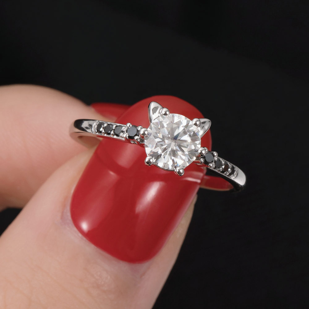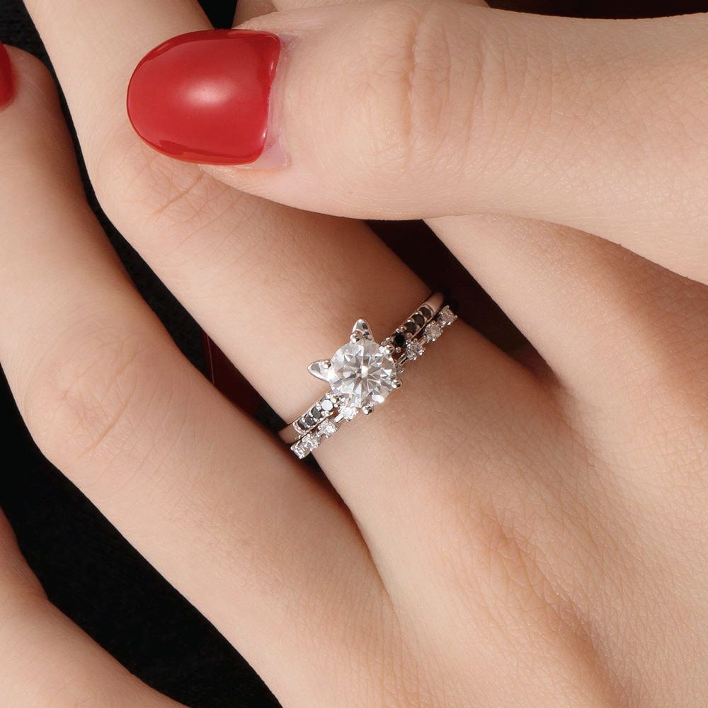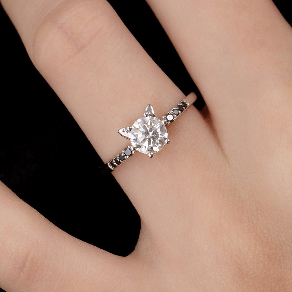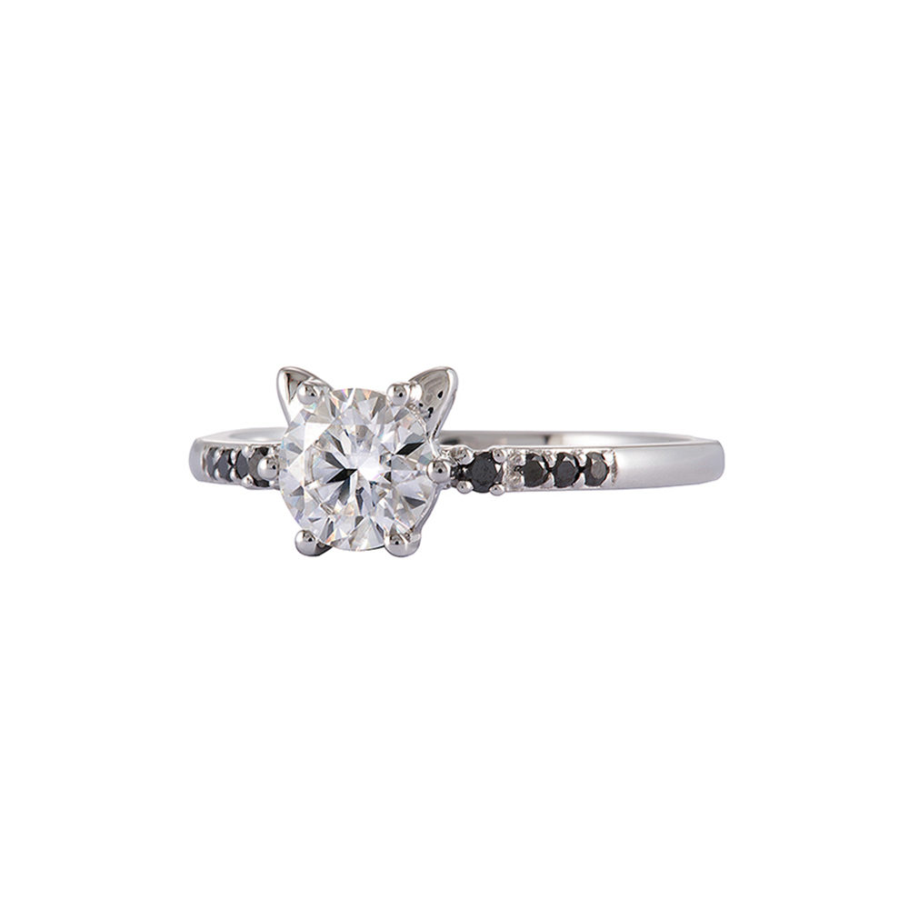 Perfect for all of the cat lovers out there, select this memorable cat engagement ring as a celebration of your everlasting romance and the never-ending love for your furry best friend! Dainty and delightful, this cat engagement ring glistens with a round center stone framed by cat ears for a truly magical style of adoring cat enchantment. Side diamonds sit nestled on the slender band, all in a bright shine. Stack this fetching cat engagement ring with a wedding band or wear it solo.
