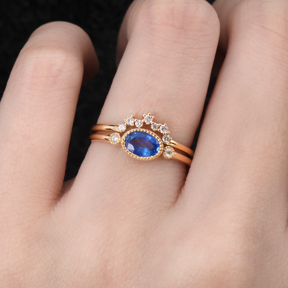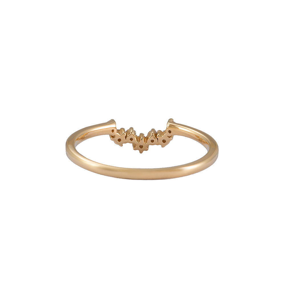 A fanciful cluster of round brilliant cut natural diamonds on this airy wedding ring gives it a sparkling half moon shape. The asymmetrical top makes it perfect for wearing with a solitaire engagement ring, providing a graceful harmonious balance as it encompasses the center stone. Stack this understated diamond band with other statement rings if desired.