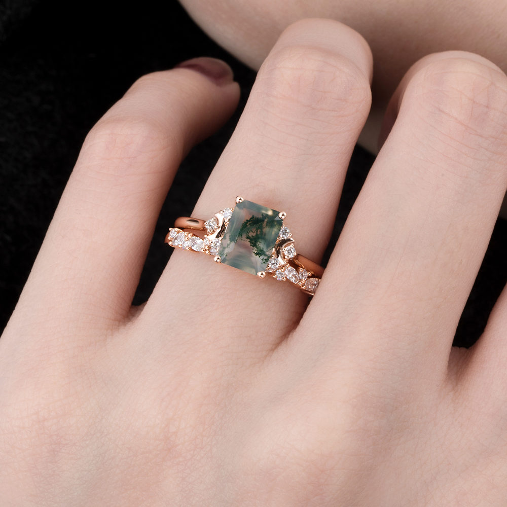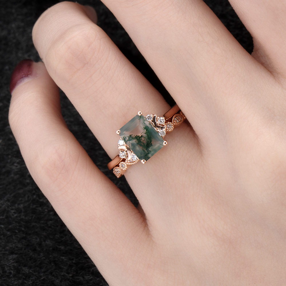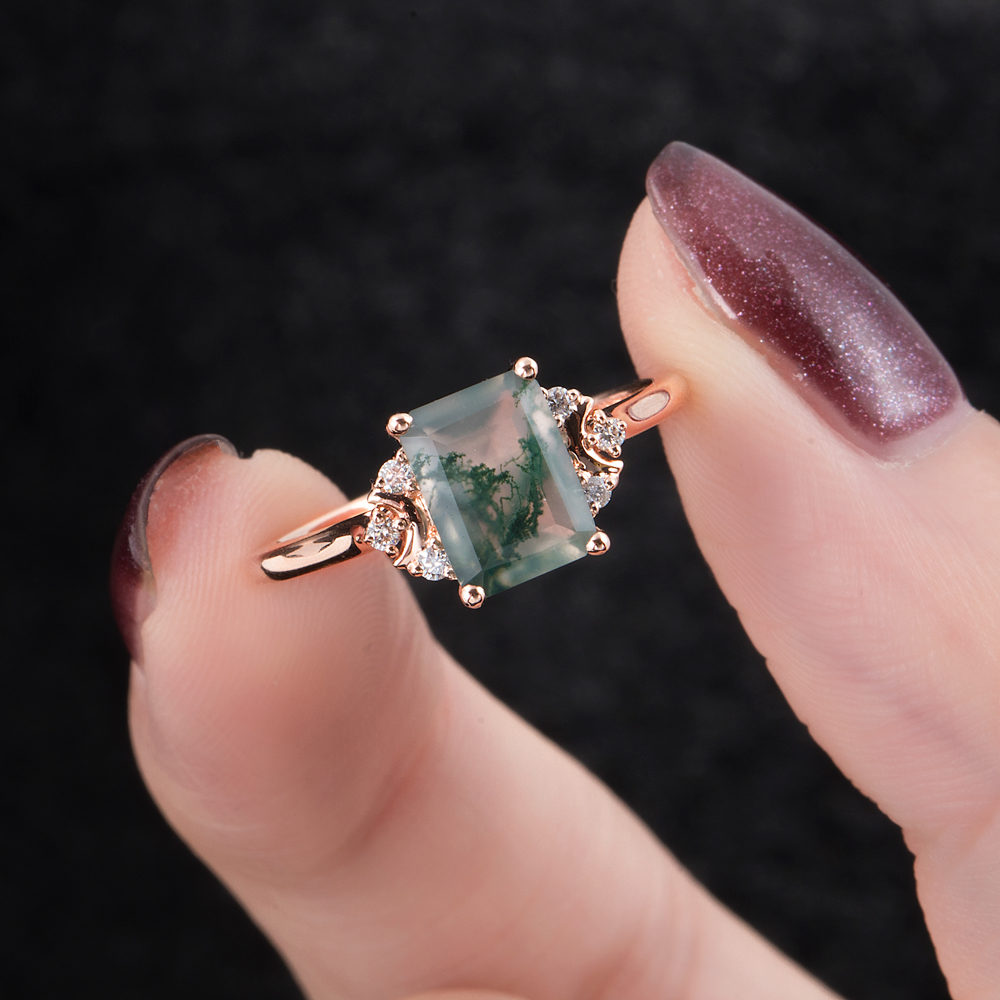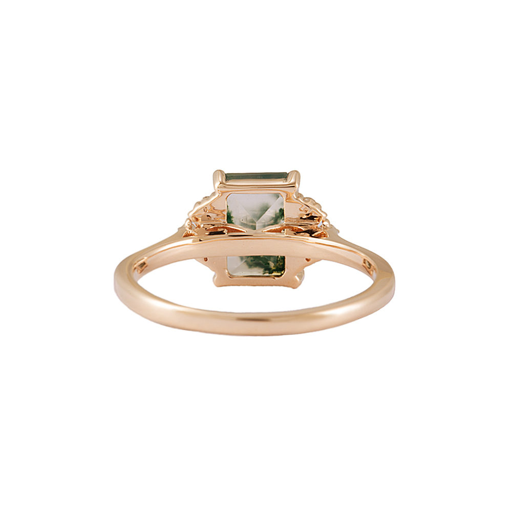 Take a chance on the extraordinary with this glamorous moss agate engagement ring, ornate with delicate detailing and touched by nature inspiration. An emerald-cut moss agate sits nestled in a four-prong setting in the center, complemented by round-cut natural diamond sides. Smooth crescent moons on each side give it a new level of magic and mystery. “Aspen” is the perfect ring for those who simply adore the mysterious forest and the magic of nature.