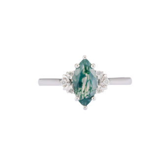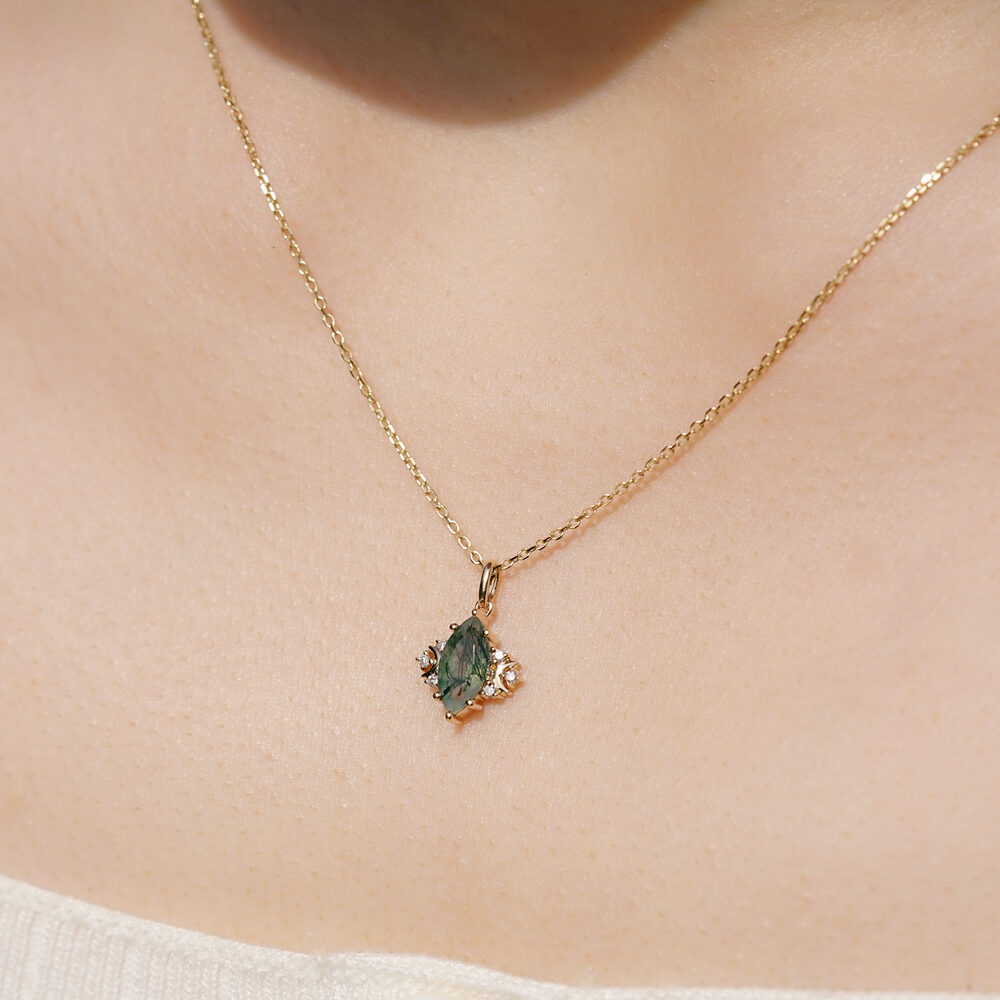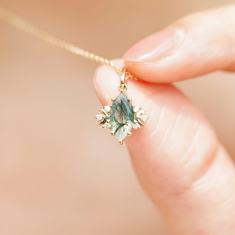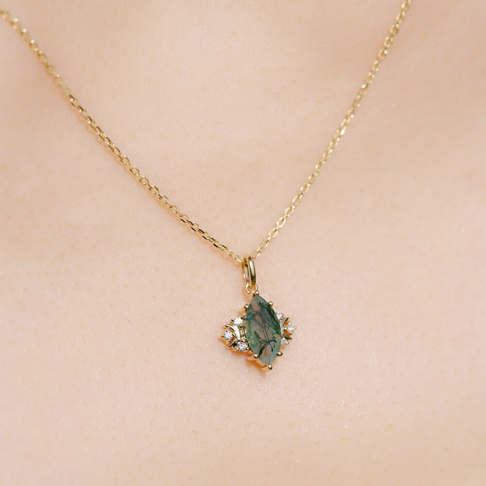 Bathed in ethereal light, crescent moons weave their spellbinding magic across the night sky. Our exquisite moss agate necklace, Spring, showcases a captivating marquise-cut moss agate at its center, elegantly suspended from a delicate chain. The lush, vibrant hues of the moss agate harmoniously blend with the sparkling diamond accents that embellish the pendant, creating a stunning fusion that makes this necklace an exceptional anniversary gift or a cherished keepsake to commemorate a special occasion.