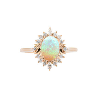 Bathed in ethereal light, crescent moons weave their spellbinding magic across the night sky. Our opal necklace, Ophelia, showcases a captivating marquise-cut Australian opal at its center, elegantly suspended from a delicate chain. The mesmerizing opal harmoniously blends with the sparkling diamond accents that embellish the pendant, creating a stunning fusion that makes this necklace an exceptional anniversary gift or a cherished keepsake to commemorate a special occasion.