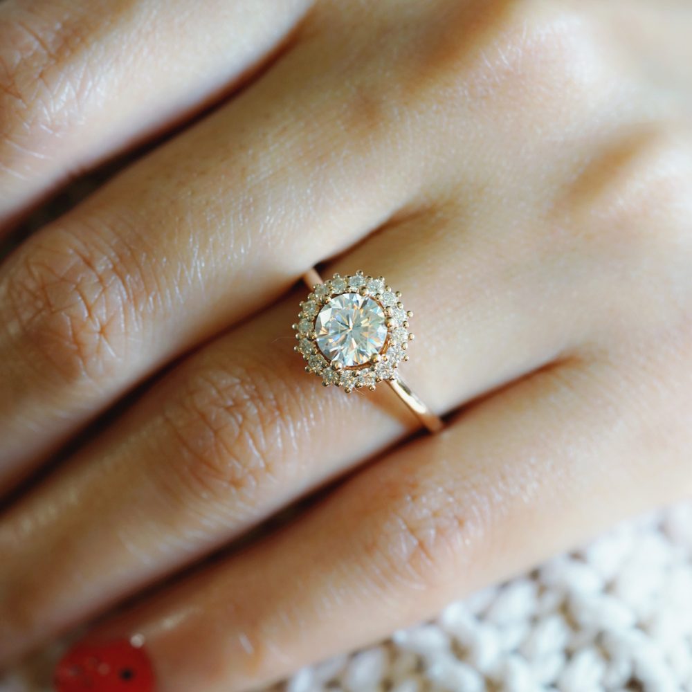 Bring that sparkle forward and do not be shy with the courageous “Calla” on your finger. Shyness is not a thing with this confident Moissanite ring. The moissanite sits firmly in the center, cradled by the diamond halo around it. The complete lack of color adds to the overall effect of elegance and timeless appeal to the wearer of “Calla”. Due to its everlasting chic style, this ring is the perfect choice for engagements and weddings.