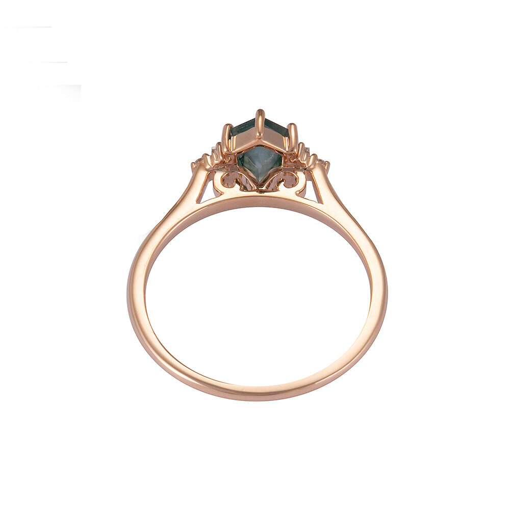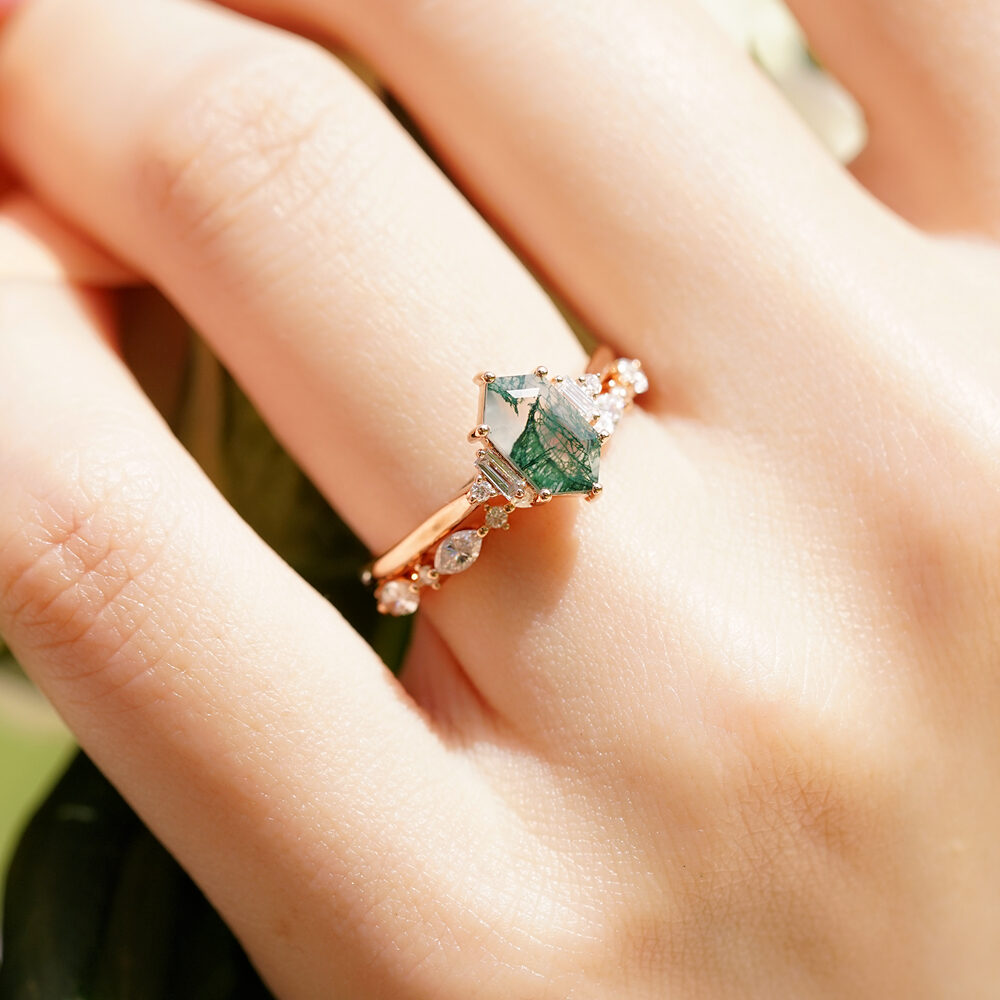 Enhance your style with this vintage-inspired hexagon moss agate ring, expertly crafted to embody nature’s splendor. The enchanting moss agate centerpiece is flanked by baguette-cut and round diamonds for a captivating allure. Grace your hand with this unique moss agate ring, and let its charm showcase your refined taste and love for nature’s beauty.