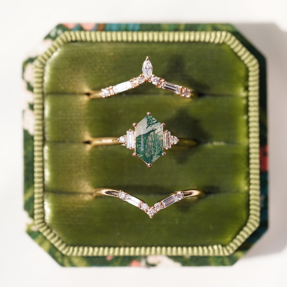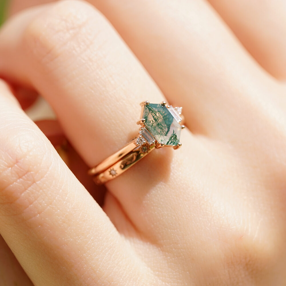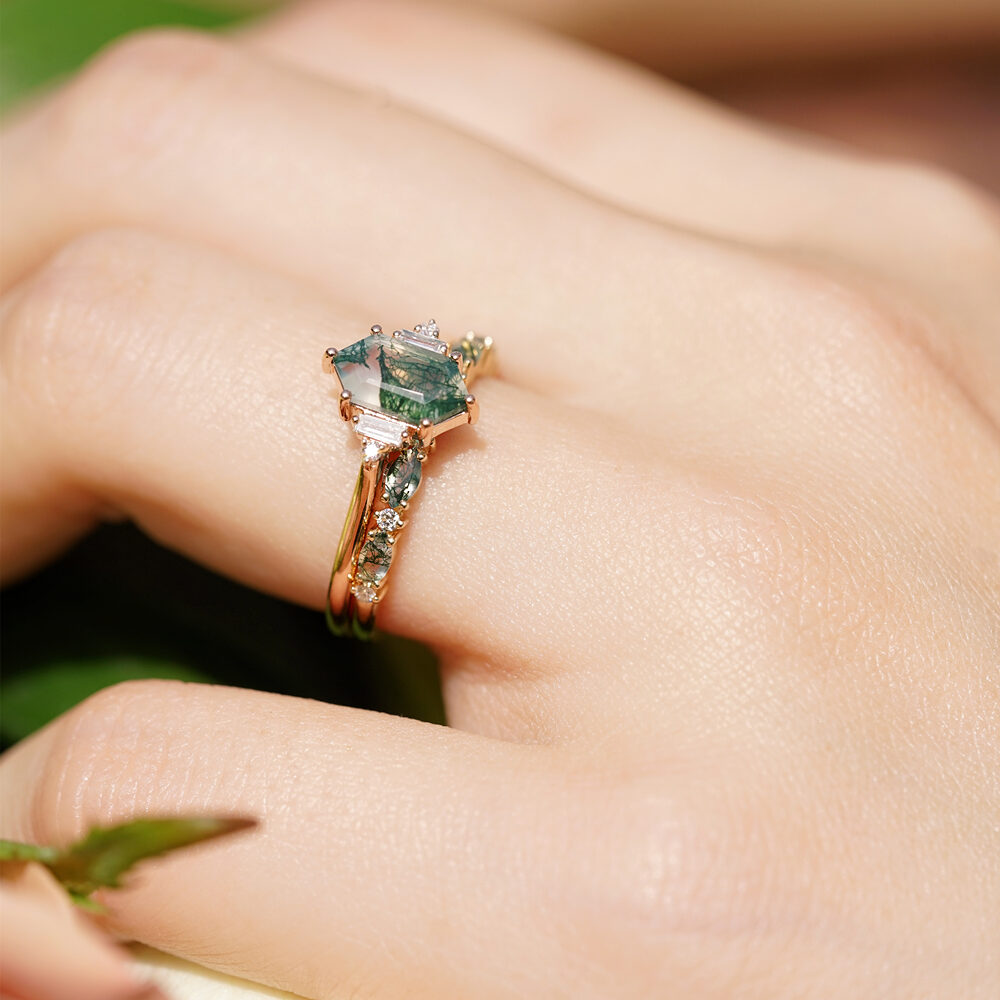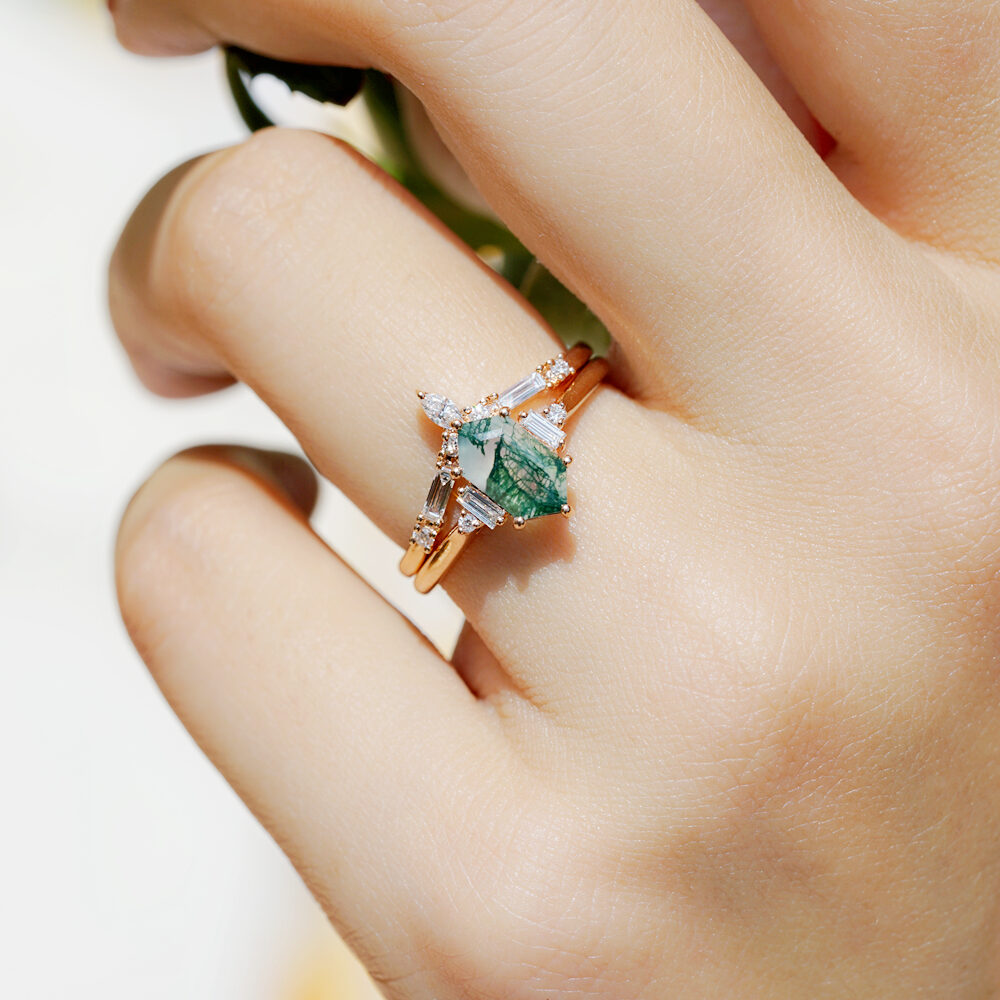 Hexagon Moss Agate And Baguette Diamond Ring – Wren