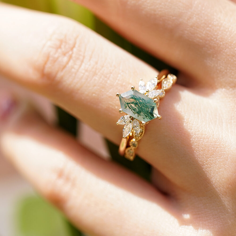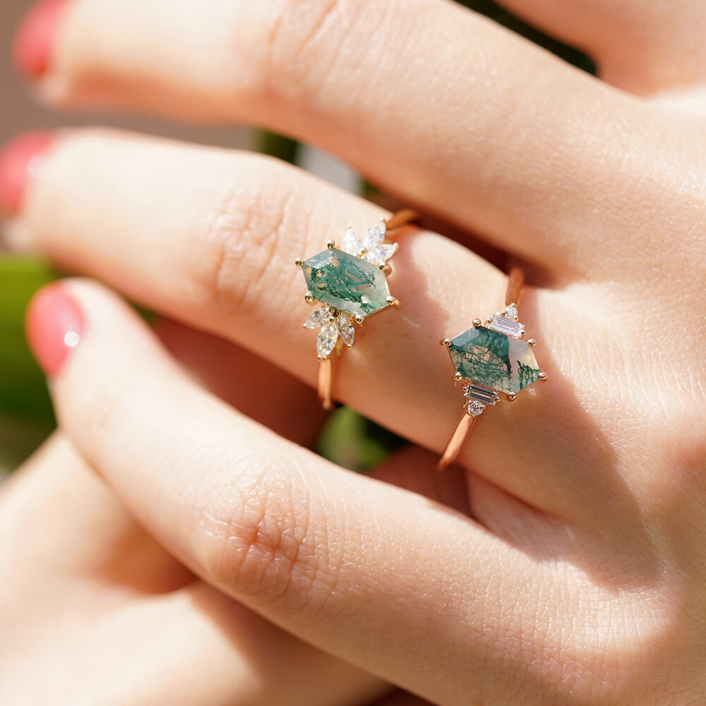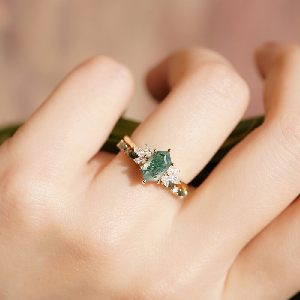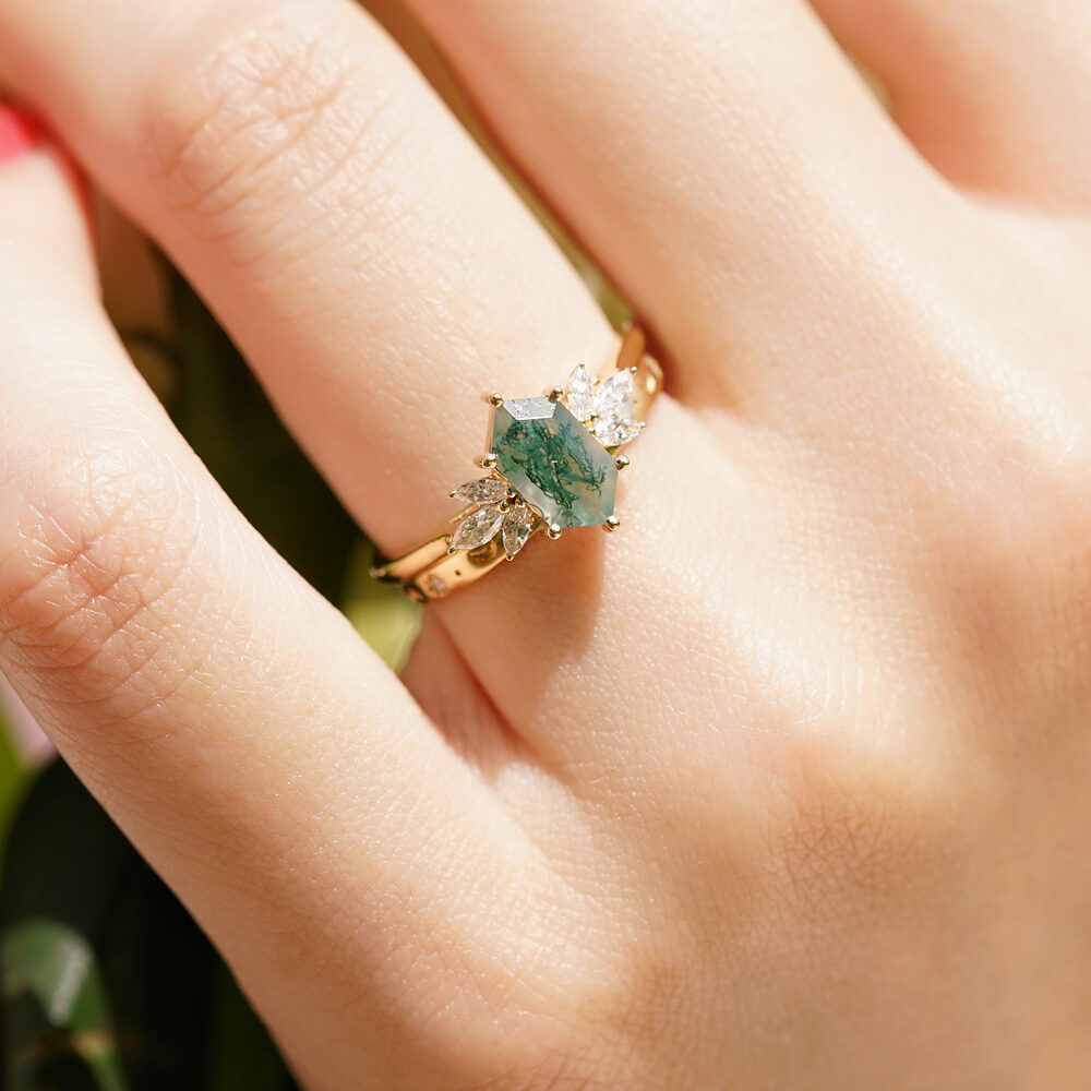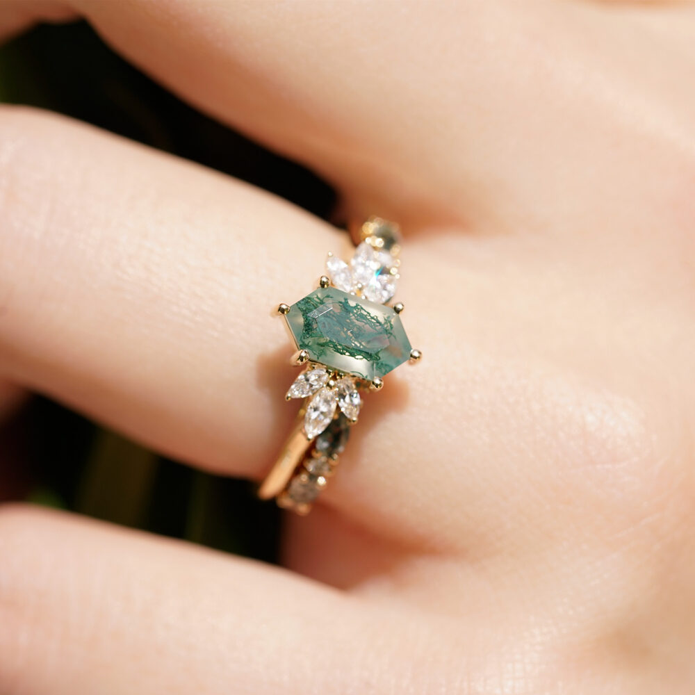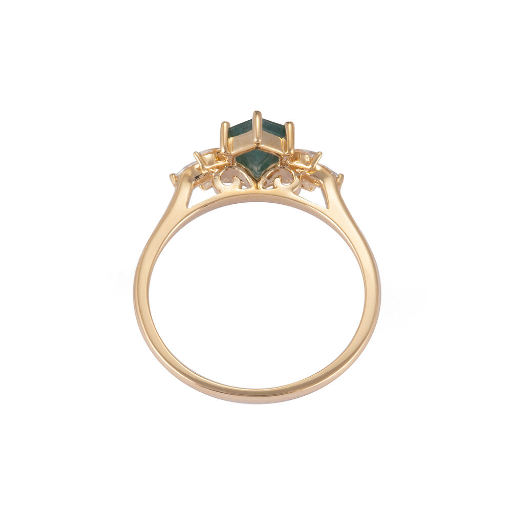 Drawing inspiration from nature’s magic and timeless romance, our Meadow hexagon moss agate ring is a true testament to love’s enchanting embrace. A captivating hexagon-cut moss agate stone takes center stage, accompanied by three marquise-cut diamonds on each side. Commemorate your love story with the mystique of moss agate and let the diamonds’ brilliance be an enduring symbol of your enchanting journey together.