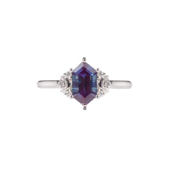 Celebrating the captivating allure of alexandrite, Mabel features five marquise-cut alexandrites, showcasing their remarkable color-change ability. Six sparkling round-cut diamonds are precisely set between these alexandrites, creating a mesmerizing dance of light and color. The exquisite interplay of alexandrite’s chameleon-like hues, shifting from green to purple under different lighting, and the diamonds’ timeless brilliance, forges an extraordinary harmony that stands out. Crafted with a sleek band for ultimate comfort, this unique alexandrite wedding band promises to elegantly adorn the finger with its unparalleled beauty.