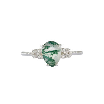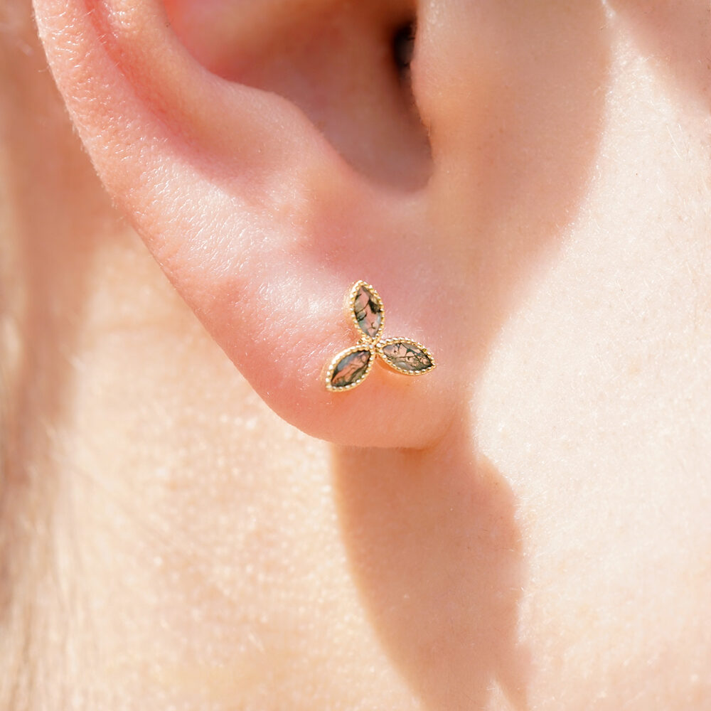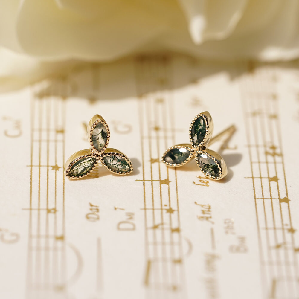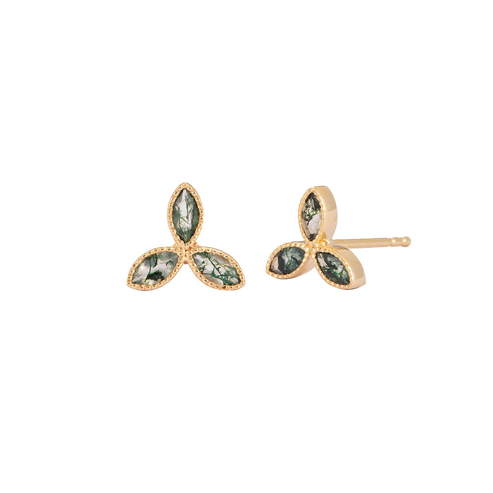 The enchanting moss agate studs are inspired by the delightful shape of a clover. Each stud features three marquise-cut moss agates, bezel set and is adorned with delicate milgrain detailing. These charming earrings make a perfect gift for nature enthusiasts or anyone seeking a unique touch in their jewelry collection.