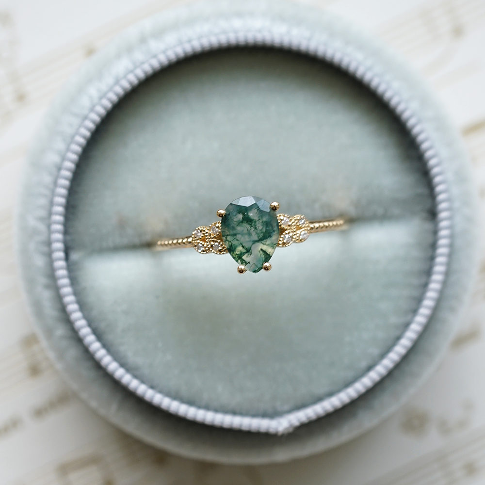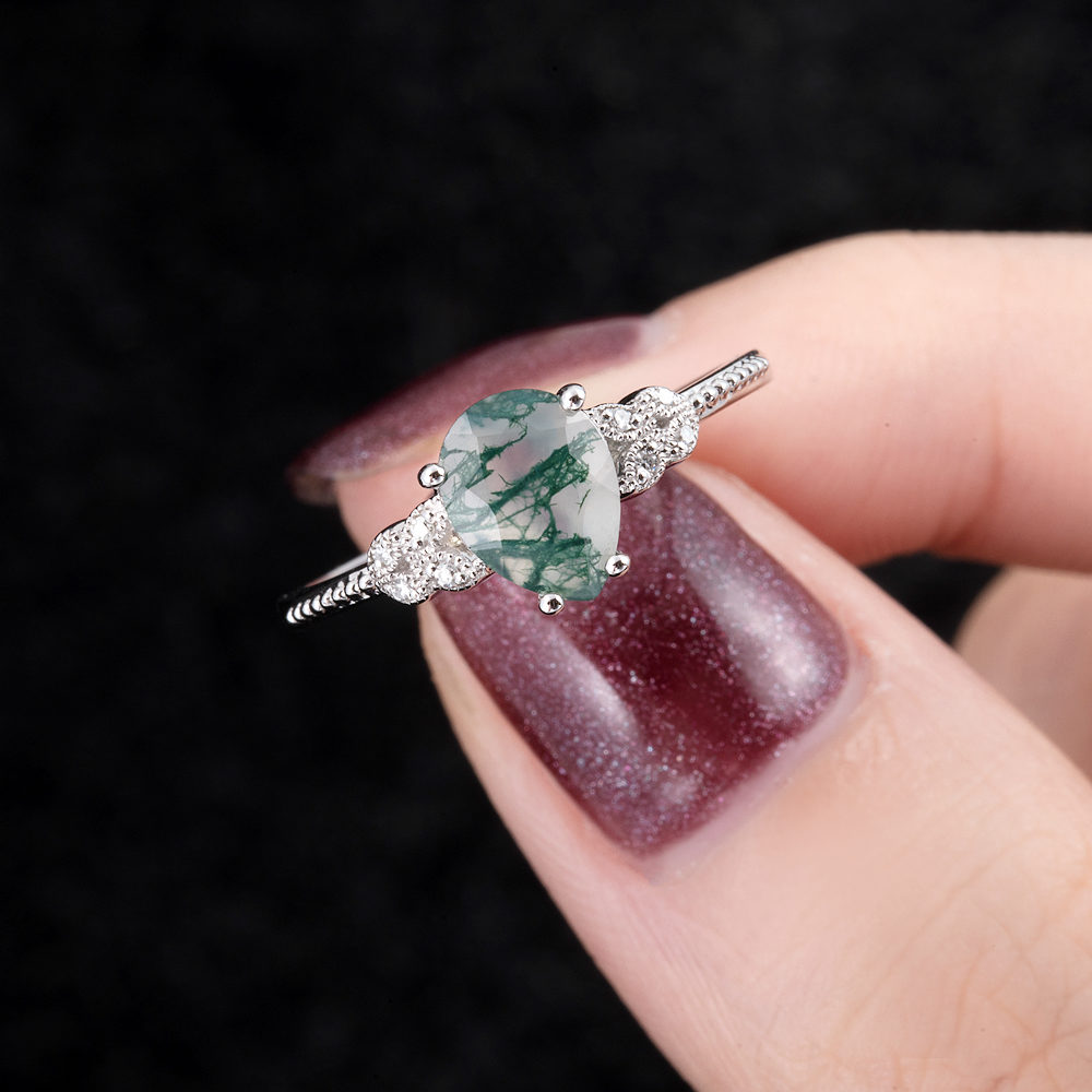 Inspired by the wondrous, effortless beauty of nature, this fanciful pear-cut moss agate engagement ring features delicate lines and unique detailing, creating a mesmerizing cluster filled with fire and prestige. A pear-shaped moss agate sits secured in a prong setting in the middle, calling to mind fresh sparkling raindrops in the forest. The center moss agate is flanked by round diamonds artfully placed in leaf clusters on each side, making it a true nature-inspired beauty.
