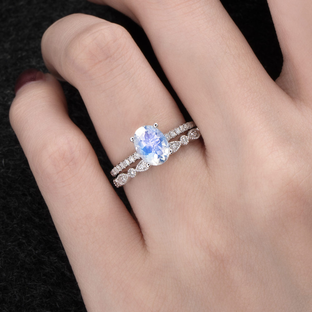 Our “Reese” is always charming and eager to flirt with admirers, just like the ladies whose fingers are bestowed with this ring. Its oval cut blue moonstone makes the essential pillar for an impactful ring, as it will certainly gather questions such as: What is this precious gemstone? Moreover, the visual of “Reese” is enhanced on the side too, because the moonstone is surrounded by a bunch of hidden diamonds, acting as a tranquil aura.