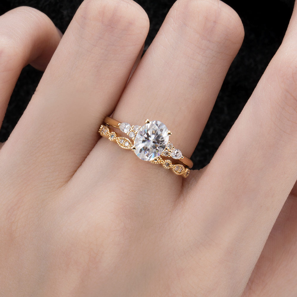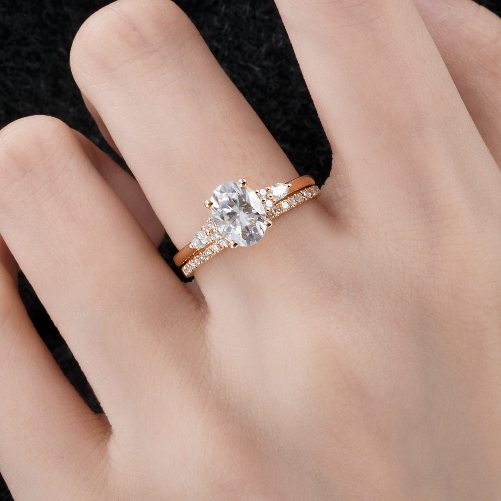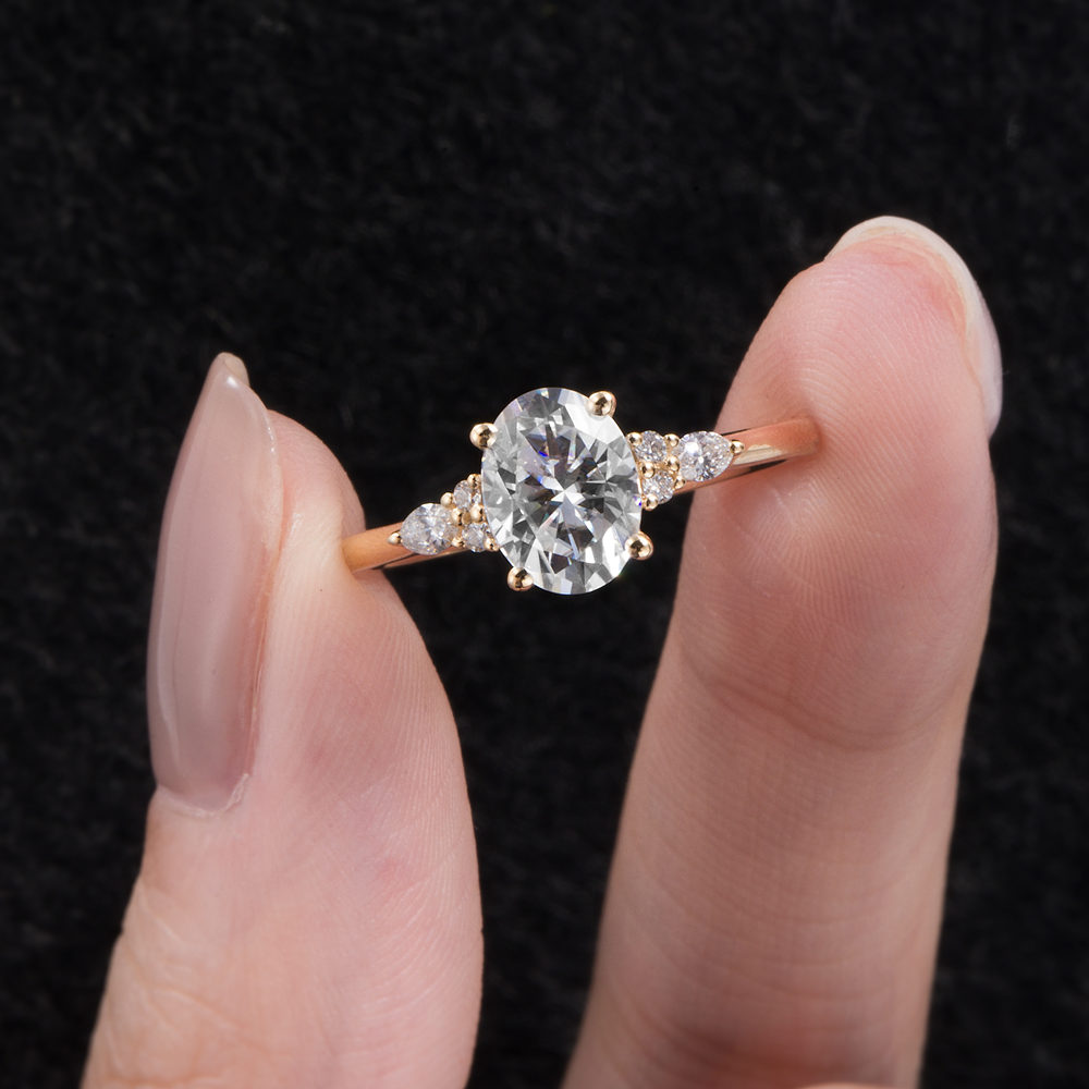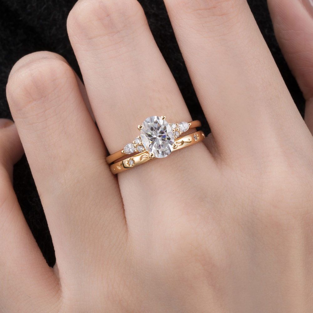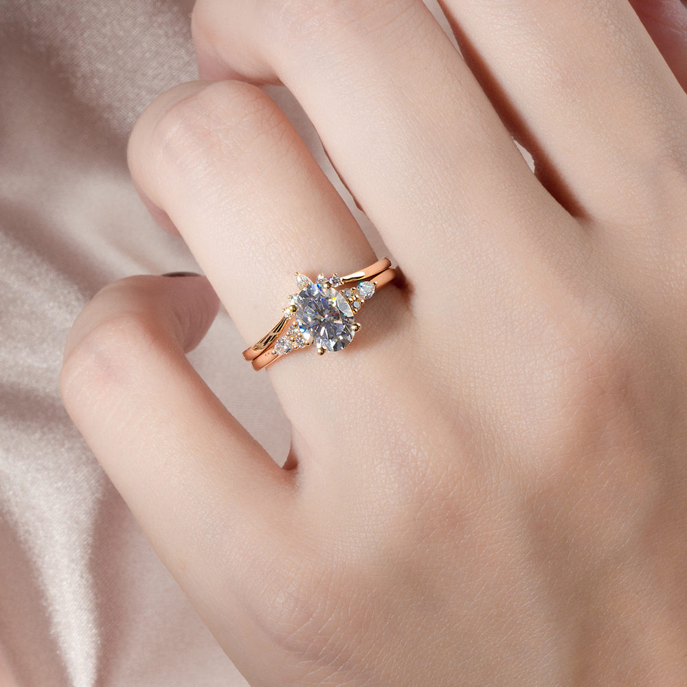 Say “I do” with keepsake memories and timeless elegance by selecting a breathtaking Moissanite engagement ring, classic in vintage style and captivating. An oval-cut moissanite stone sits secured in a prong setting. Glistening round brilliant and marquise cut natural diamonds on each side of the oval center add fire and prestige, all atop a raised Cathedral mounting tapering into a comfortable slim band.