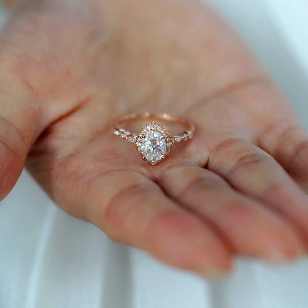 The center stone of this engagement ring is the avantgarde moissanite, captured in a floral halo of timeless white precious diamonds. Why stop the bedazzling there? “Bergman” certainly did not. Its upper shank is enhanced by singles and doubles of white diamonds too. This vintage inspired masterpiece is going to bring glamour to any ensemble a lady wearing it goes for.