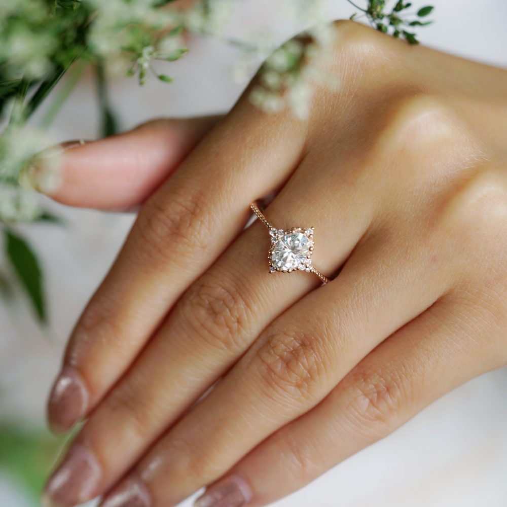 Vintage by definition, “Mae” never fails to amaze with its innate graciousness and poise, like it is crafted for medieval princesses or Roman goddesses. The center oval Moissanite is there with the aim to impress everyone around, as it is truly exceptional and breaks the mold of ordinary gems. Having a bunch of diamonds around it, the presence is truly magnificent. Add a dotted shank to the mix and everything is settled.