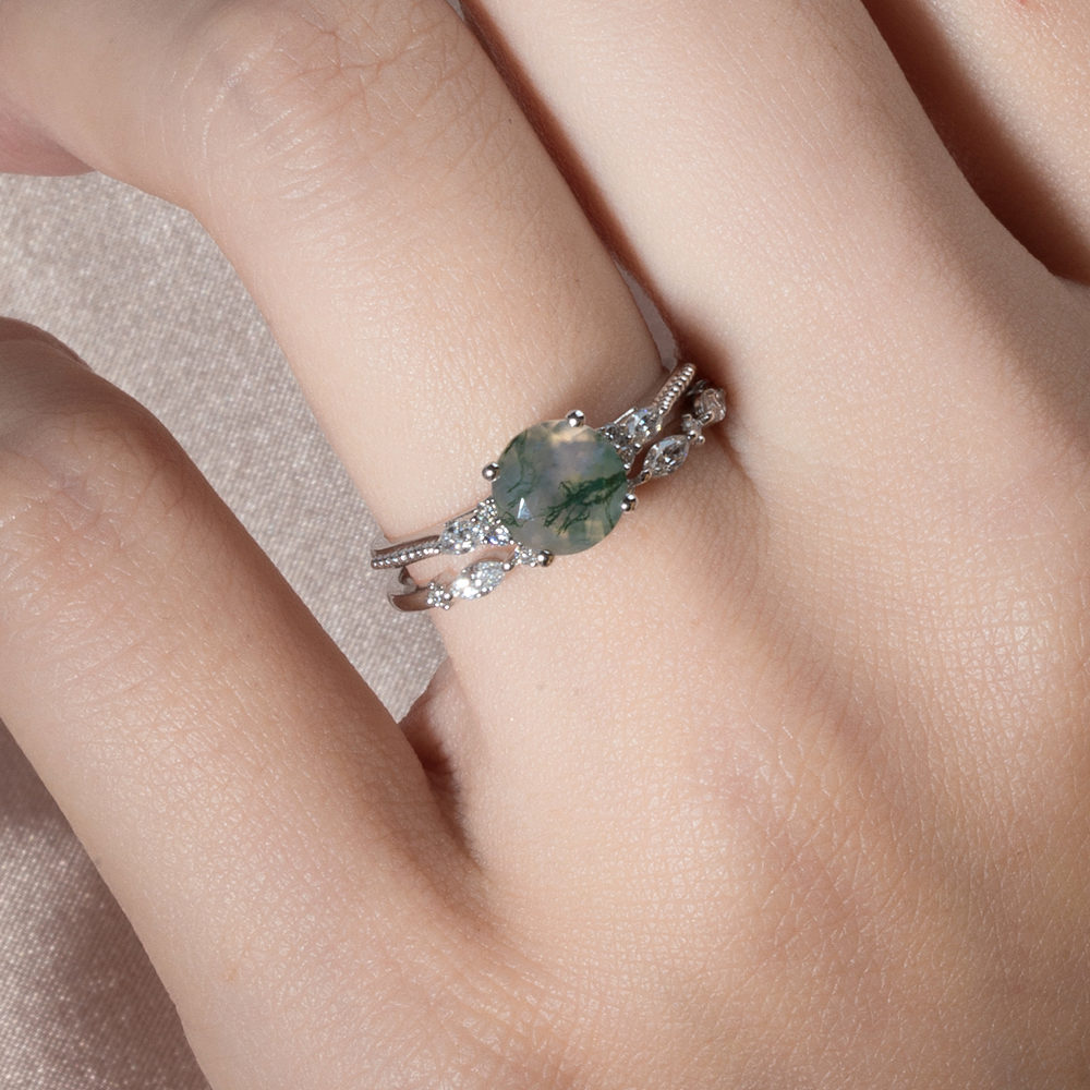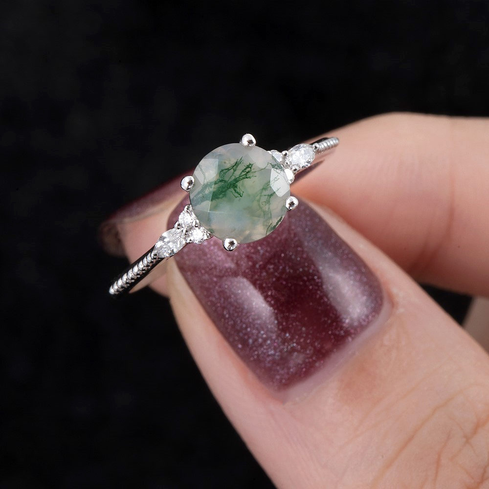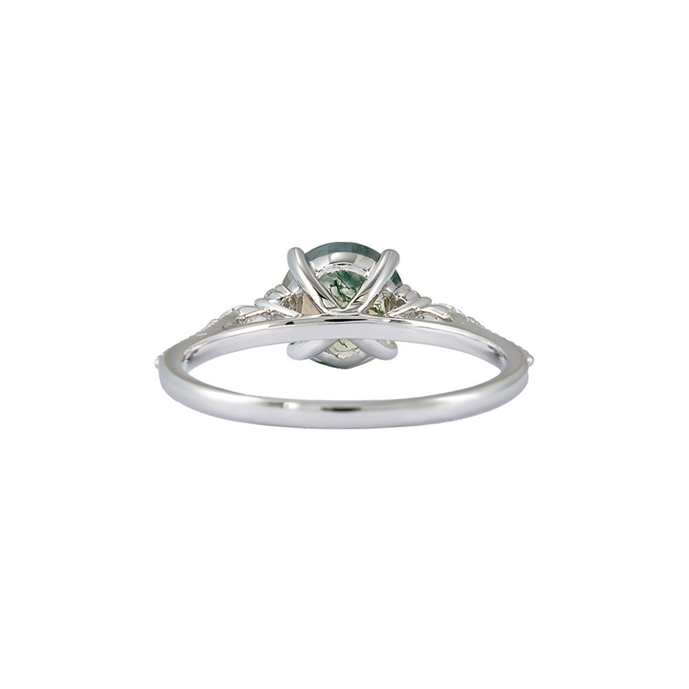 Make your special moment extraordinary by choosing a moss agate engagement ring, unique and divine. A faceted round cut moss agate center stone placed in a 4-prong setting exudes a stunning forest beauty with its striking pattern arrangement. Marquise and round cut natural diamond sides accentuate this enchanting basket Cathedral setting, all atop a square shoulder shank.