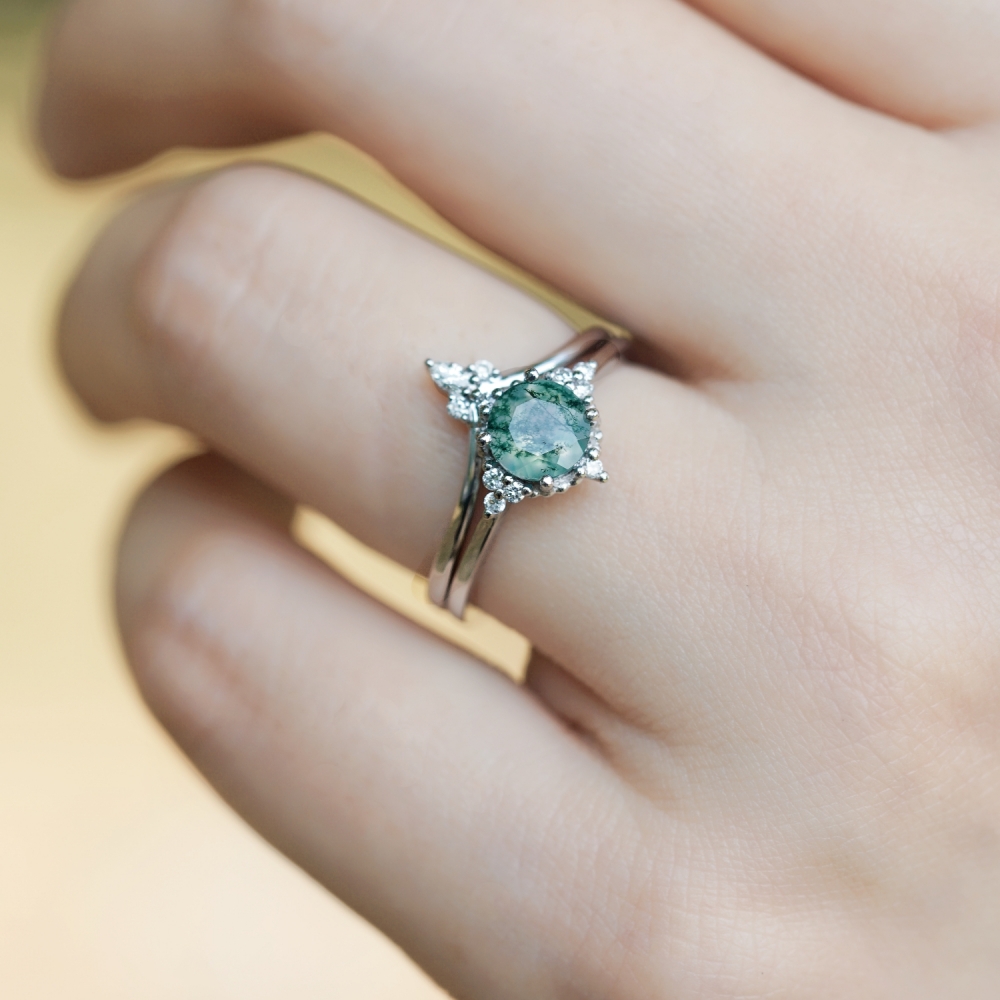 Create a symbol of quiet devotion with Ireland, a deeply personal engagement ring centered around the organic beauty of moss agate. A serene moss agate is framed by natural white diamonds in a soft, understated setting, designed to highlight balance and connection. Each moss agate is entirely unique, making every Ireland ring a one-of-a-kind expression of two souls growing together.