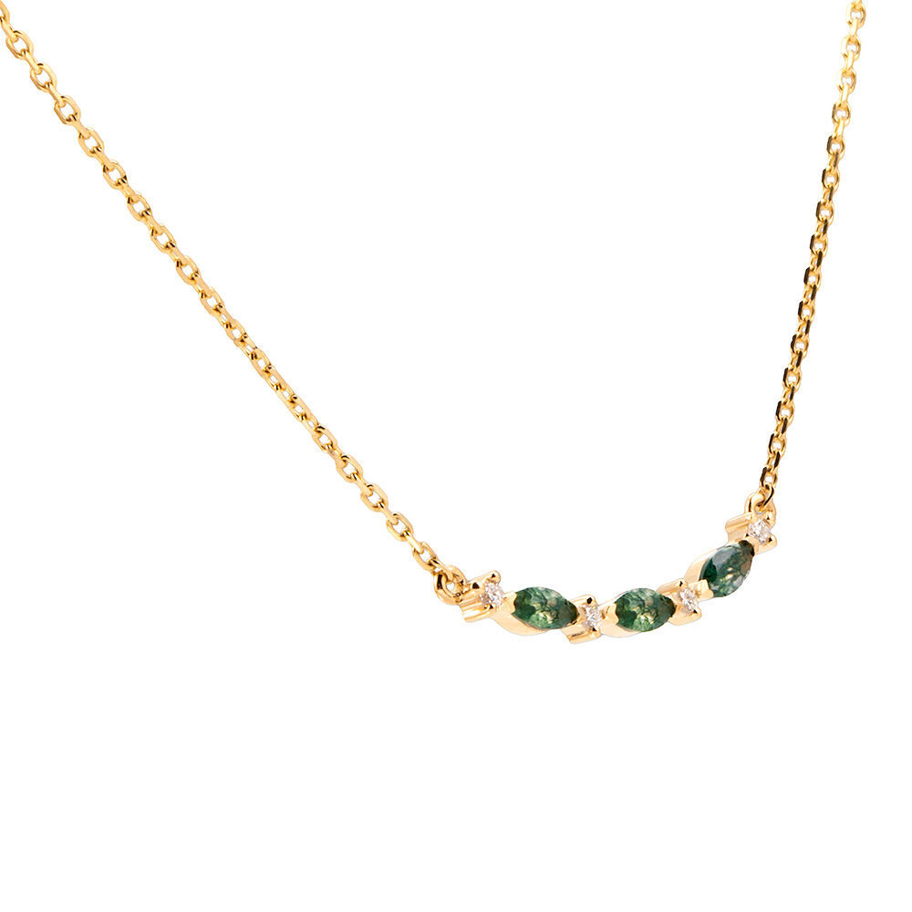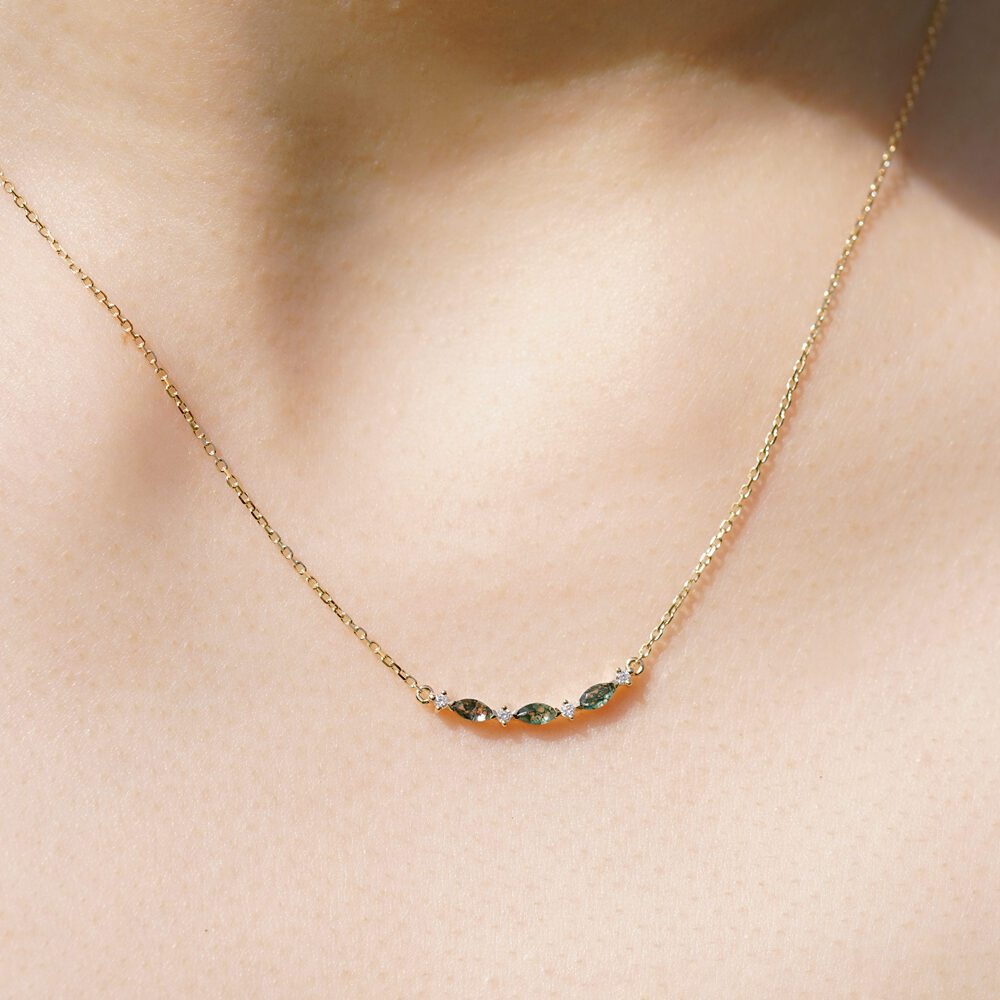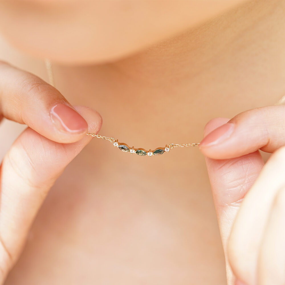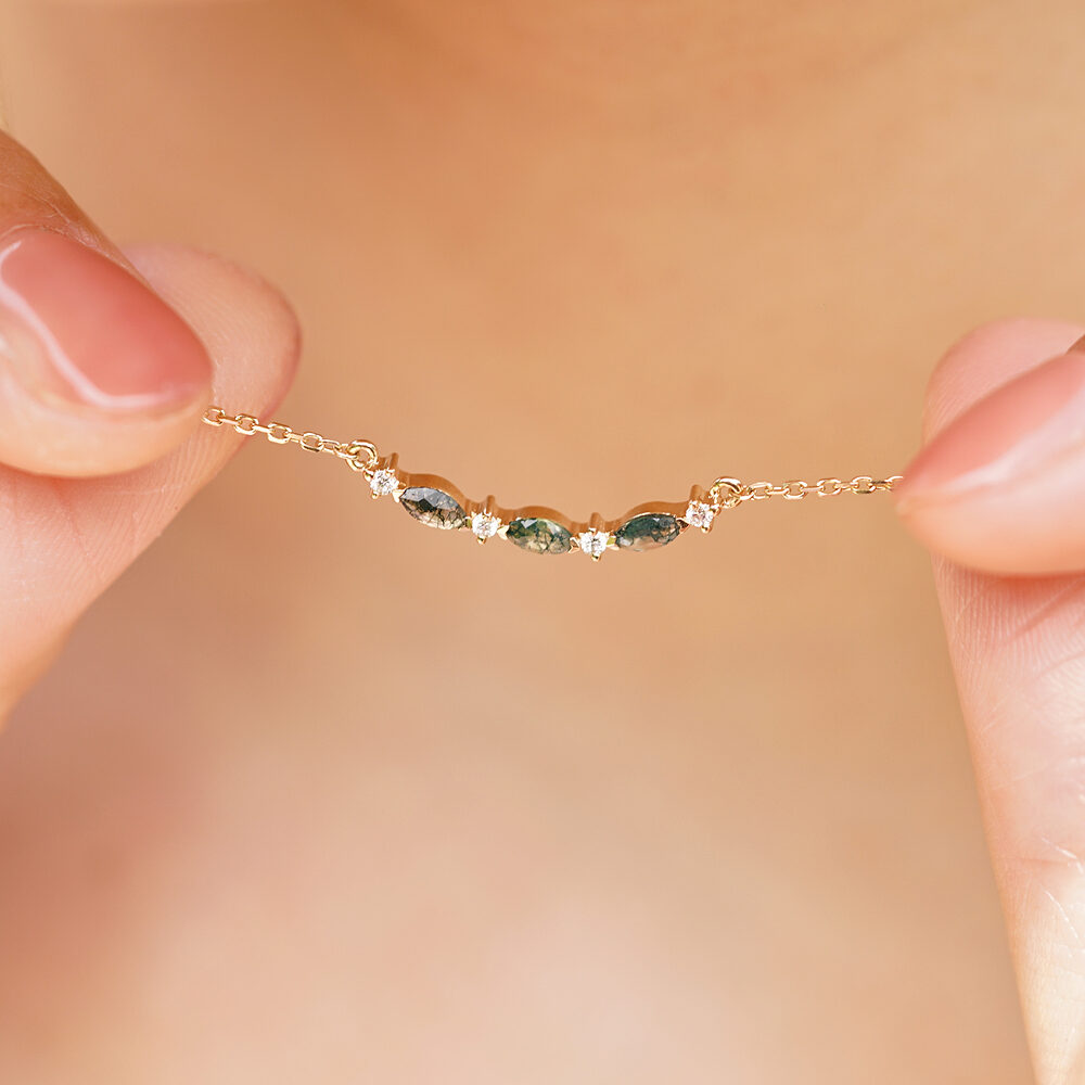 This mesmerizing moss agate necklace is a perfect harmony of elegance and nature. Featuring a captivating pattern of alternating marquise-cut moss agates and brilliant round diamonds, creating a row of seven stunning stones. Make a statement with this unique, eye-catching design that transitions gracefully from day to night.