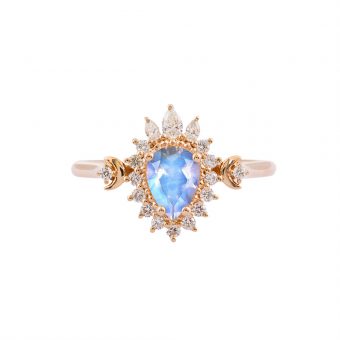 “Magic mirror, on the wall–who is the fairest one of all?”. Snowflake-like “Mary” captures your attention with a shimmering moonstone surrounded by four genuine white diamonds. Inspired by nature’s beauty, “Mary” represents the eternal magic love between a confident modern princess and her remarkable gentle prince.