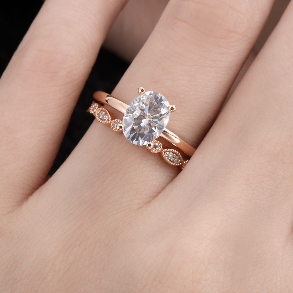 Classic styles always manage to keep the highlight on themselves, as there is no such trend that could come in their way. The best case of that statement is “Leah”, an engagement ring that could be easily imagined gracing the hands of your grandma, yourself and your daughter. This heirloom-material ring features the carefully cut Moissanite in a four-prong setting. Lacking color and additional gems, this is the genuine engagement ring for a bride-to-be who stays true to her values.