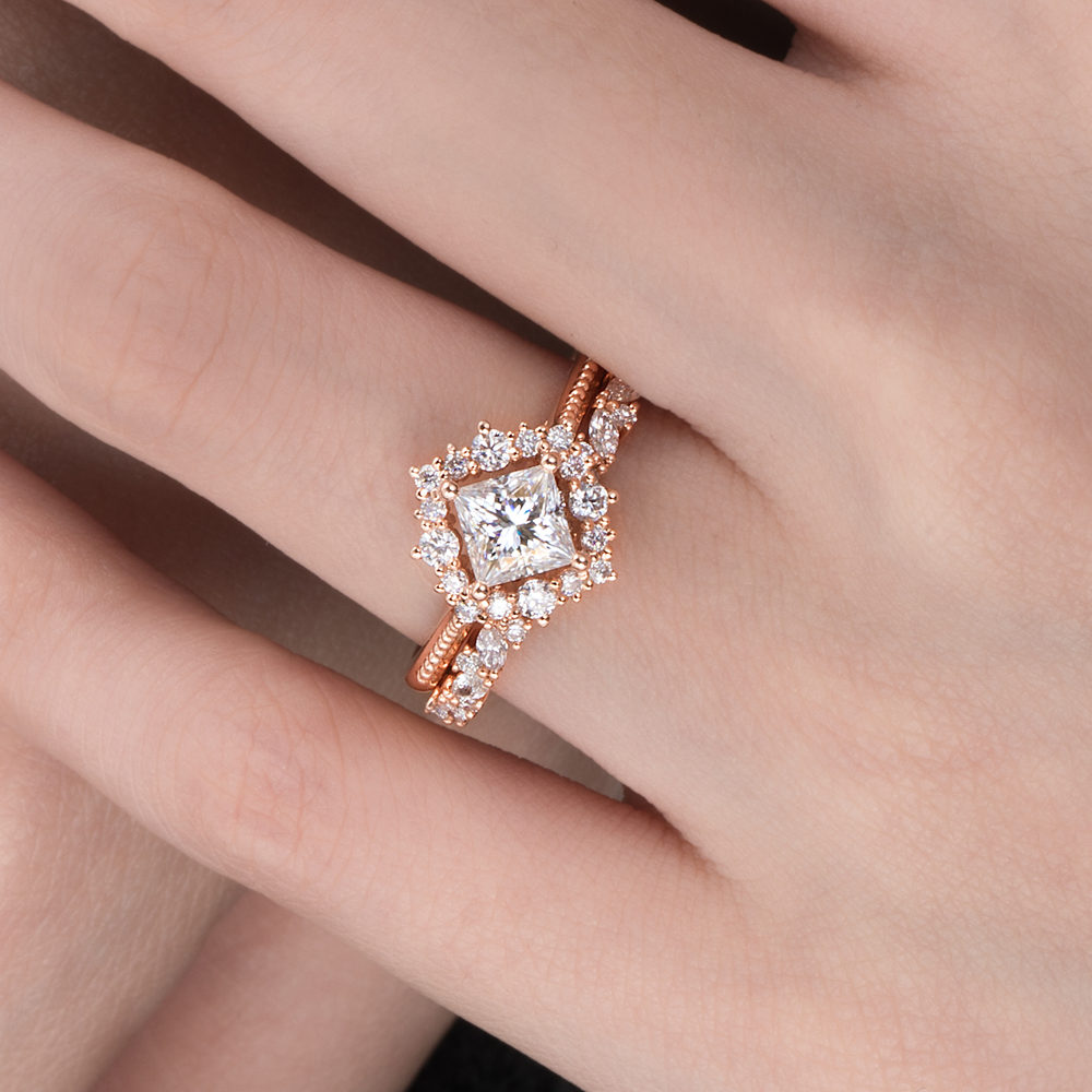 This gorgeous, brightly polished, square-cut Moissanite engagement ring features incredible color, elegance, and fire. Glittering accent diamonds are prong-set in a decadent display, complemented by the shiny milgrain band that comfortably fits any finger. Graceful openwork underneath the setting of the ring showcases keen attention to detail that adds an eye-catching, luxurious touch. Make picture-worthy memories by gifting this stunning cluster Moissanite engagement ring to your beloved for any anniversary, birthday, or holiday occasion.