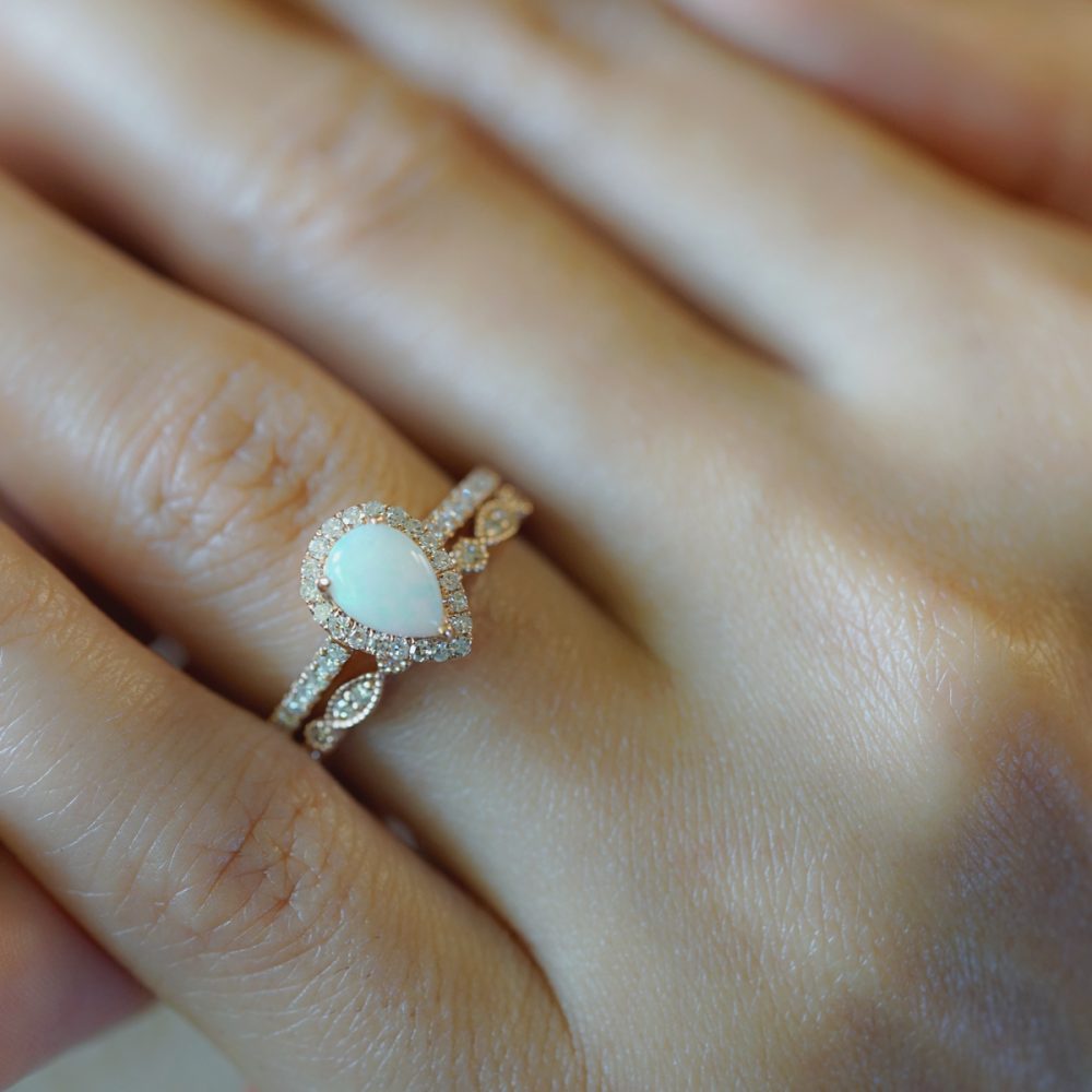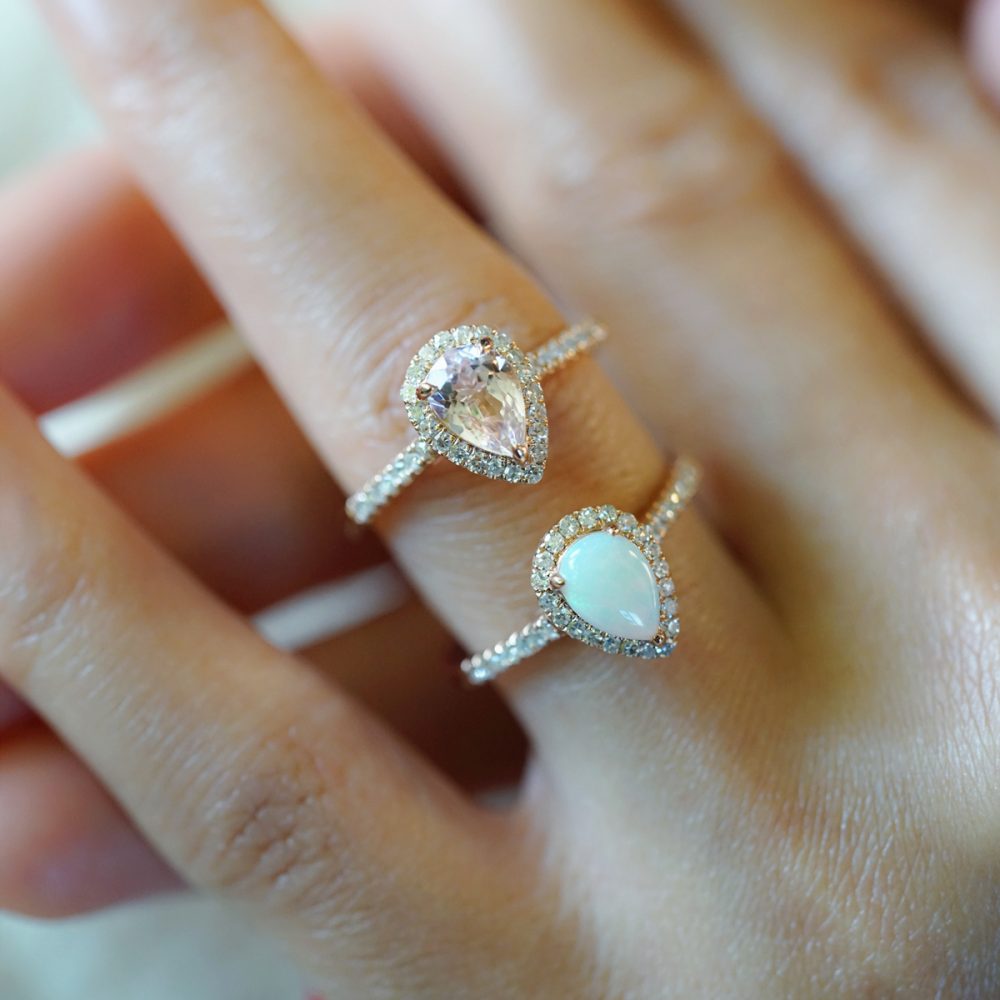 Timeless is the key vibe surrounding “Billie”, a ring that looks like it could easily be borrowed from your grandmother’s jewelry chest box. Teardrop Australian Opal is very relevant nowadays with its minimalistic, but highly effective charm. Also, it is glam infused as much as it is vintage-inspired; the diamond halo and shank shine bright at all times.