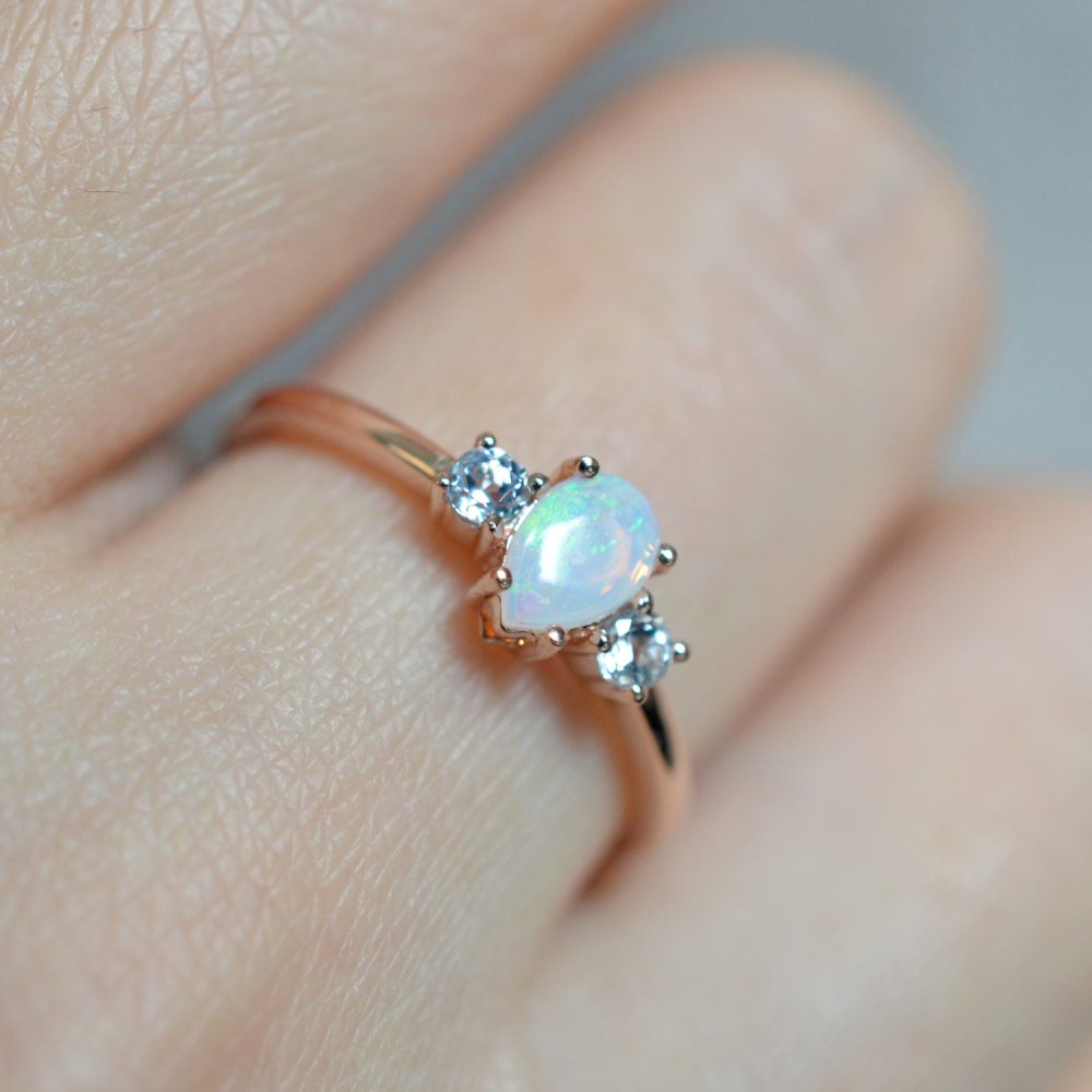 Mystical and enticing, “Imogen” has an intricate central teardrop Australian Opal, with a round Aquamarine on each side. The magical triplet looks like it is found in the precious depth of a 50s chic woman, sparkling its vintage effect all around. The Australian Opal is an artisan piece that is equally compelling and classic, with its color scheme never being the same.