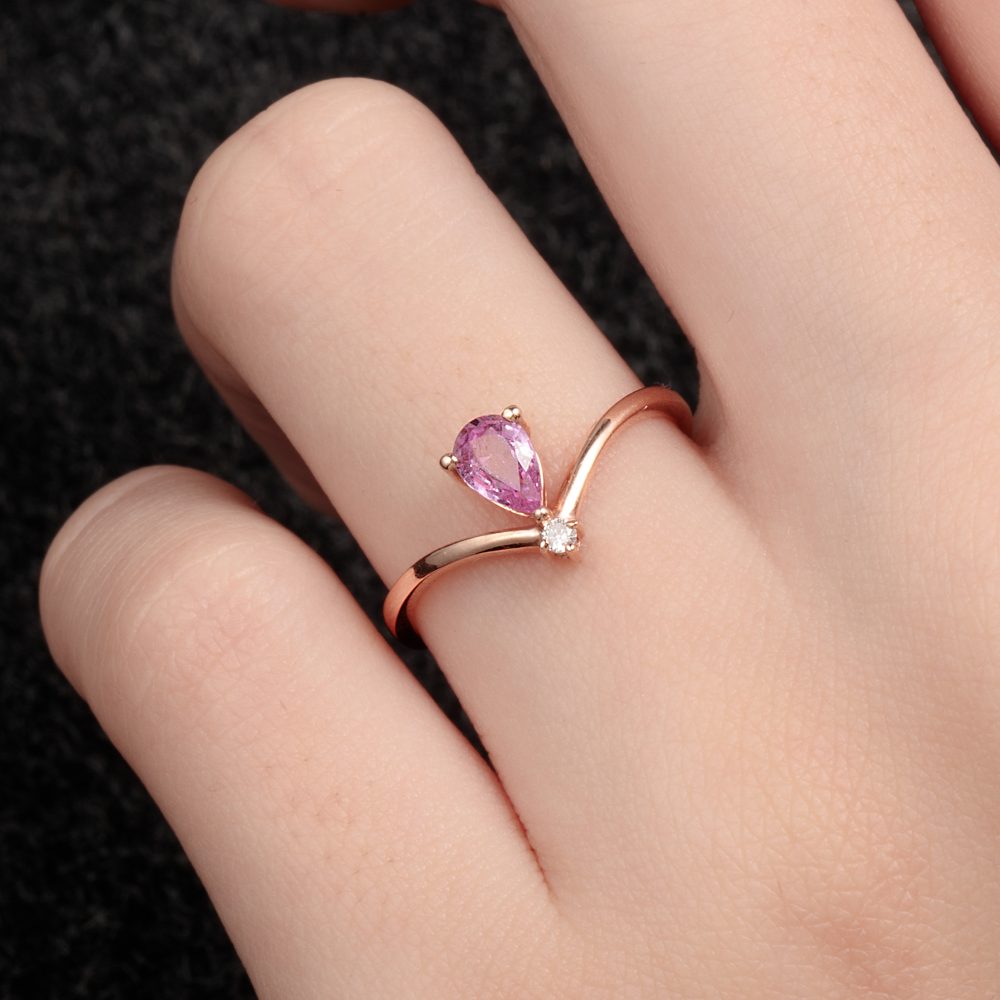 The fabulous combination of a teardrop pink sapphire and a V-shaped delicate setting leaves everyone speechless. Named after a mythological Roman goddess, our “Lucinda” illuminates gentle souls and awakes the girlish side of a lady who owns it. This romantic engagement ring brings us the smell of a fresh pink rose and represents the harmony of pure love. “Lucinda” is a suitable choice for a woman who is able to handle herself in a noble and ethical manner.