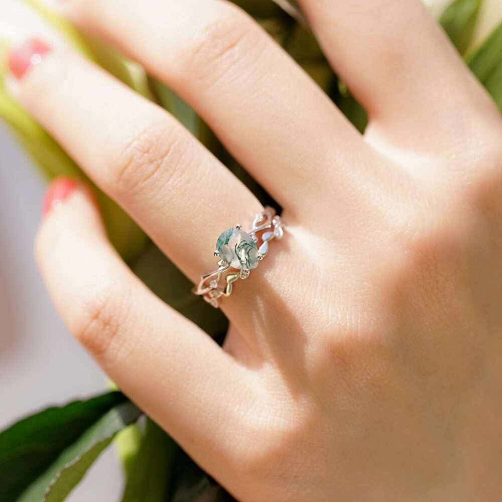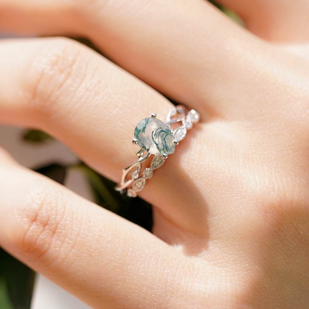 Twig Engagement Ring In Pear Cut Moss Agate – Ember