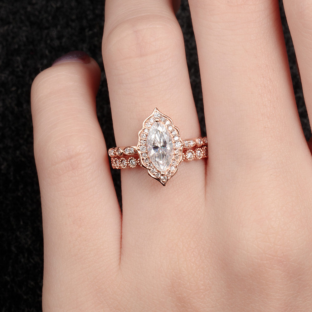 This stunning marquise alexandrite ring exudes a sophisticated style inspired by all things vintage, perfect for those who love Old World elegance and an unforgettable look on their special day. A marquise-cut alexandrite center stone sparkles in a highly detailed setting. Scintillating round brilliant cut diamonds are thoughtfully pave set around this marquise alexandrite in an ornate frame. Additional diamonds sit beautifully nestled down the slender band, finishing the look of this inspirational, delicate engagement ring. Celebrate all picture-perfect wedding and engagement memories with this glamorous marquise bridal ring.