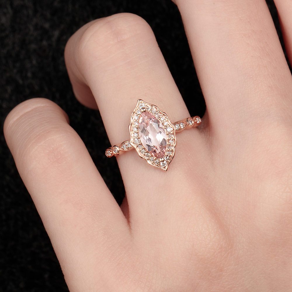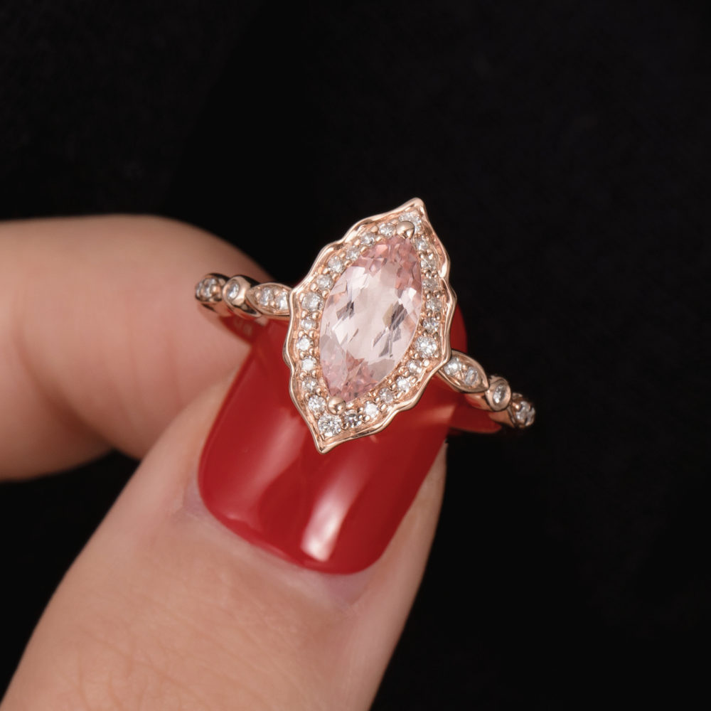 This stunning marquise morganite ring exudes a sophisticated style inspired by all things vintage, perfect for those who love Old World elegance and an unforgettable look on their special day. A marquise-cut morganite center stone sparkles in a highly detailed setting. Scintillating round brilliant cut diamonds are thoughtfully pave set around this marquise morganite in an ornate frame. Additional diamonds sit beautifully nestled down the slender band, finishing the look of this inspirational, delicate engagement ring. Celebrate all picture-perfect wedding and engagement memories with this glamorous marquise bridal ring.