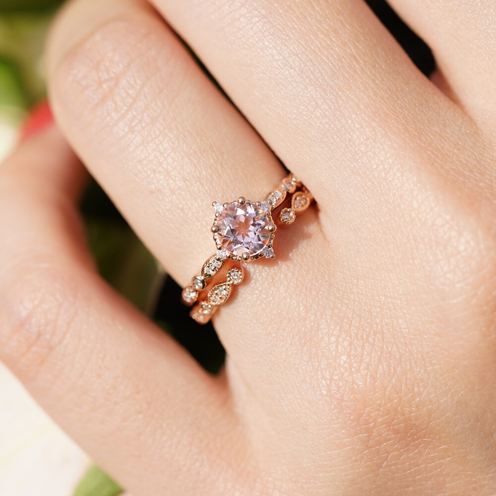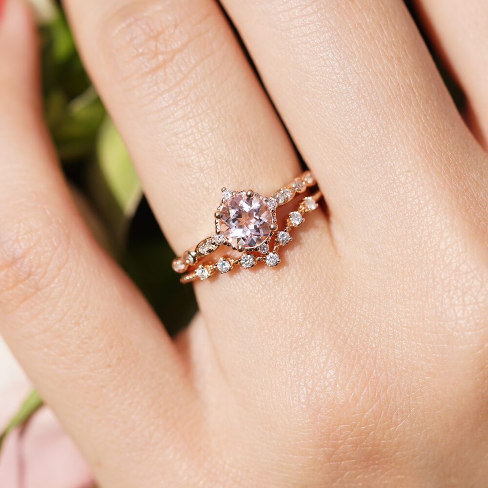Our captivating “Isabella” gives a vintage touch to your engagement plans. As enduring as it is inspiring, this morganite gemstone ring features an heirloom design. The special twisted band with genuine conflict-free diamonds radiates a fine white glow which showcases the magical beauty of this artisan piece. “Isabella” is destined for a modern woman who has lady-like roots.