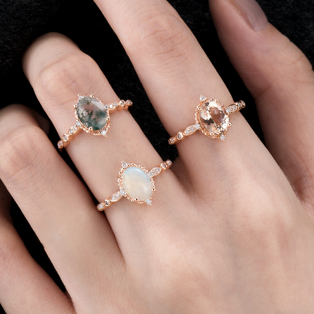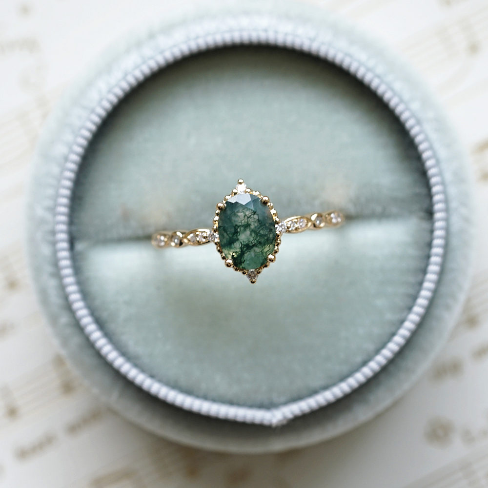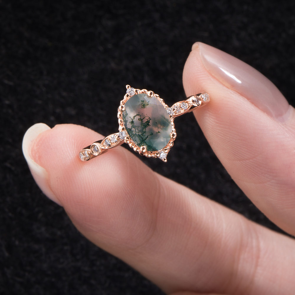 This striking vintage-style engagement ring features a faceted oval moss agate center stone secured in a classic four-prong setting. A lace-like halo sparkling with tiny round beads gives this stunning design added glamor. Glittering round brilliant cut diamonds on the brightly polished band lend luxurious detail.