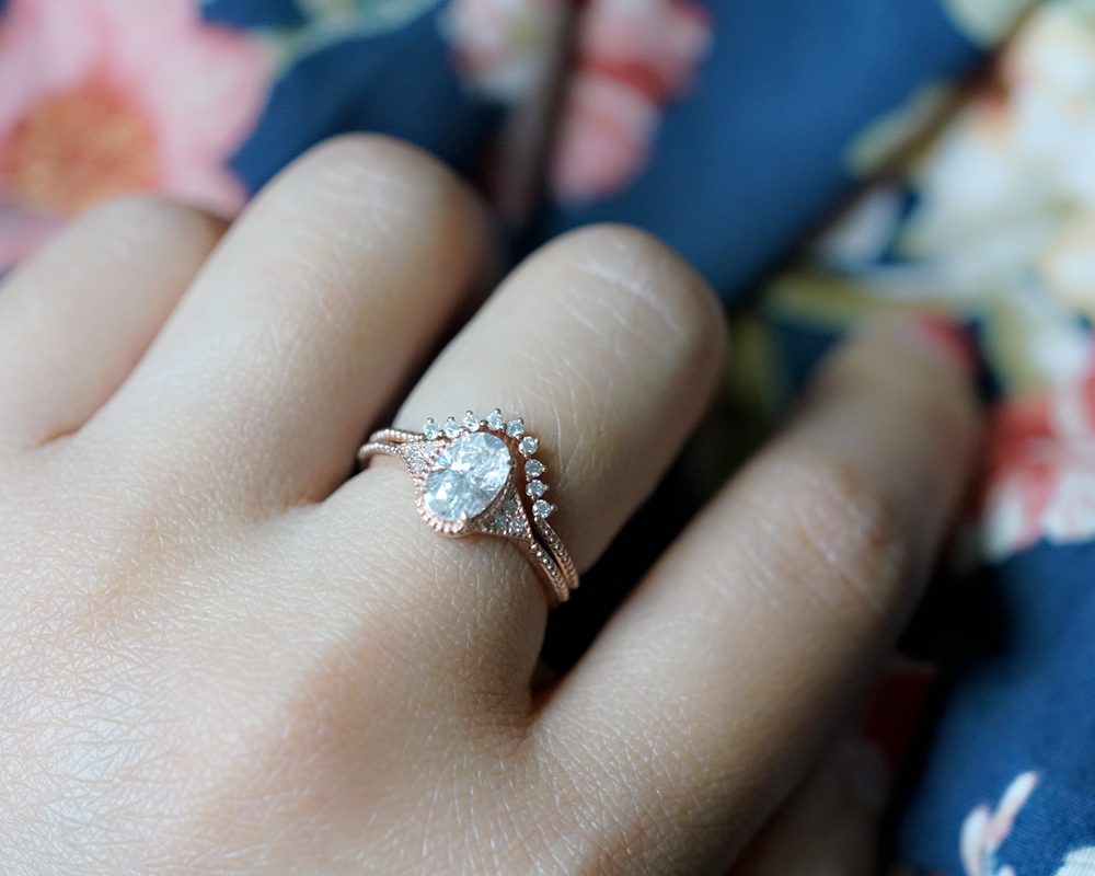 Our wedding band “Zoe” is an emblem of love lasting through time, a symbol of devotion and an agreement between two parties to love and cherish one another for the rest of their days. Nine genuine white diamonds in the center of this V shape ring shine with a dazzling display. Diamonds have been associated with eternity because of their enduring nature and strength, while there is also an association between diamonds and love. The delicate “Zoe” stacks to our oval stone engagement ring collection perfectly.